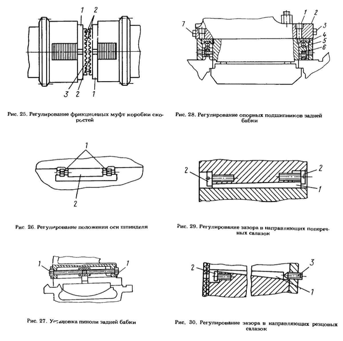 В процессе роботи или після ремонта може потребоваться регулювання степени сжатия цилиндрических пружин 4 і 5 опорных подпружиненных підшибників 6, вмонтированных в мостик задньої бабки з целью обеспечения легкости переруху задньої бабки вдоль станины.