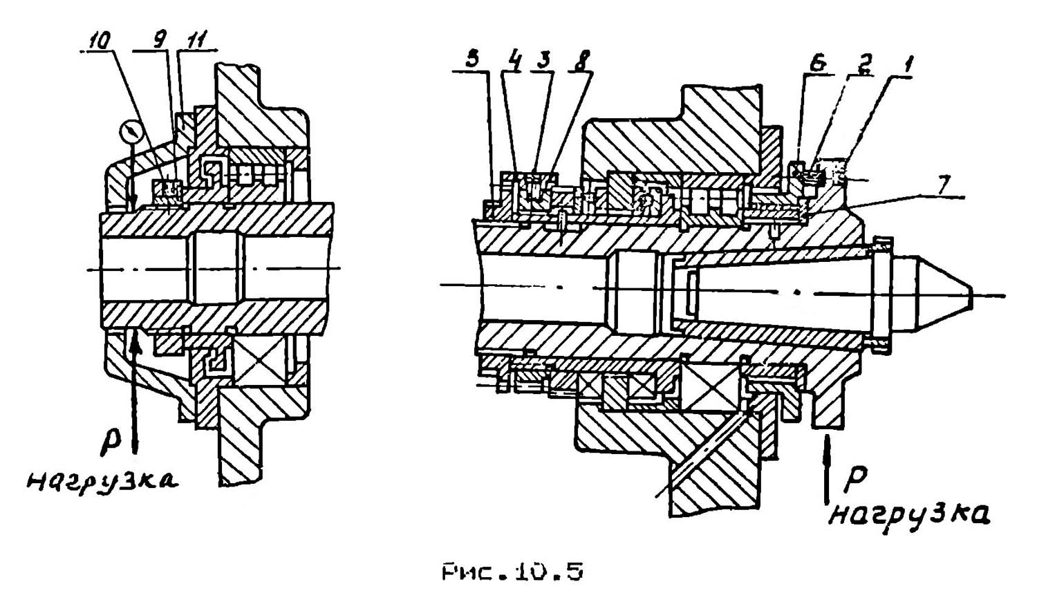 2. при помощи гайки 9 отрегулировать подшипник переміщенням его внутреннего конусного кольца до величины отжима шпинделя в вертикальной плоскости у задньої ОПОРЫ относительно корпуса передньої бабки на 40...50 мкм от нагрузки в 8 кН. Нагрузка прикладывается через динамометр к шпинделю у етой опори знизу вверх в плоскости измерения отжима (фланец 11 снять);