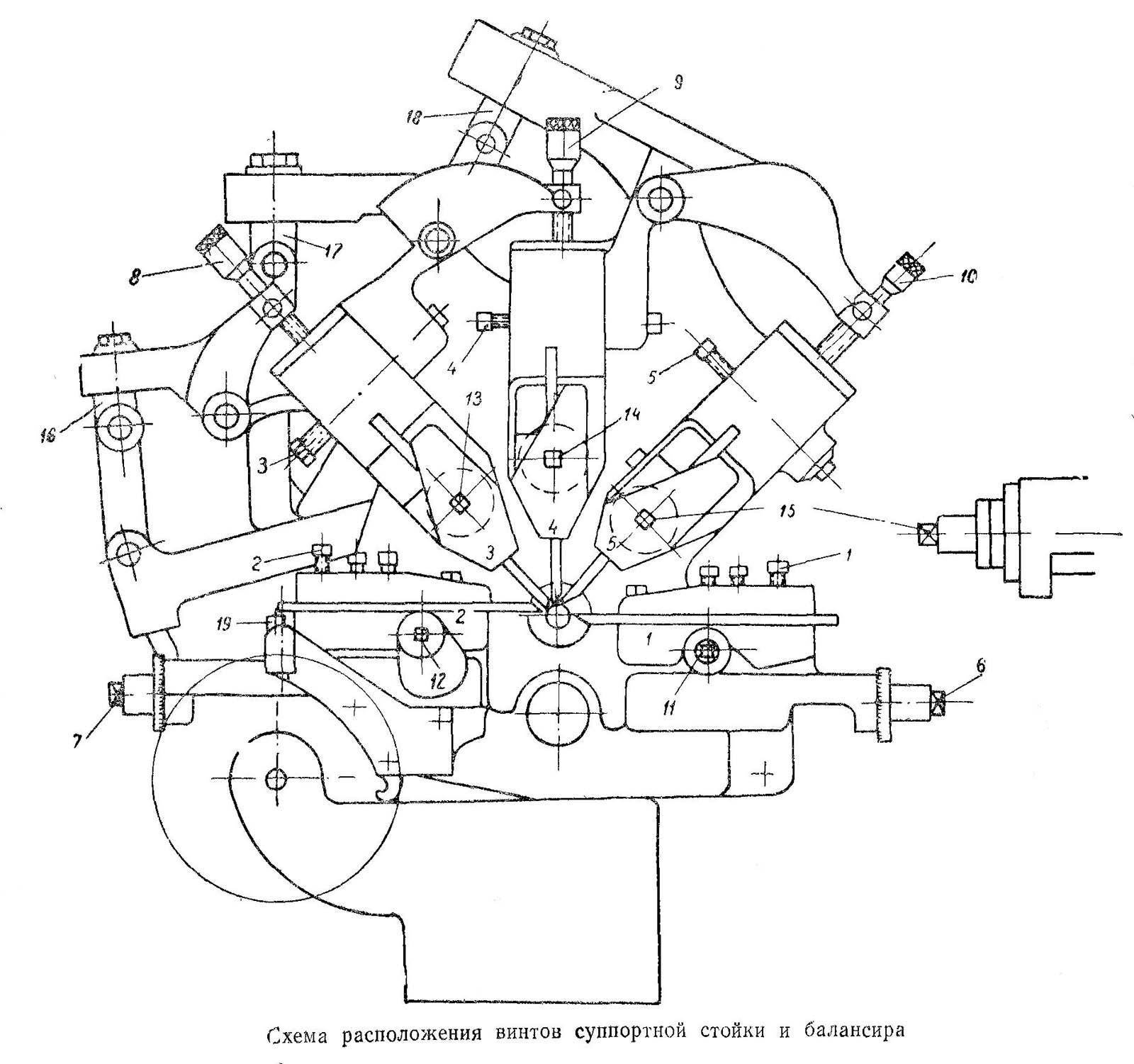 Схема розташування гвинтів супортної стійки верстата 1П12