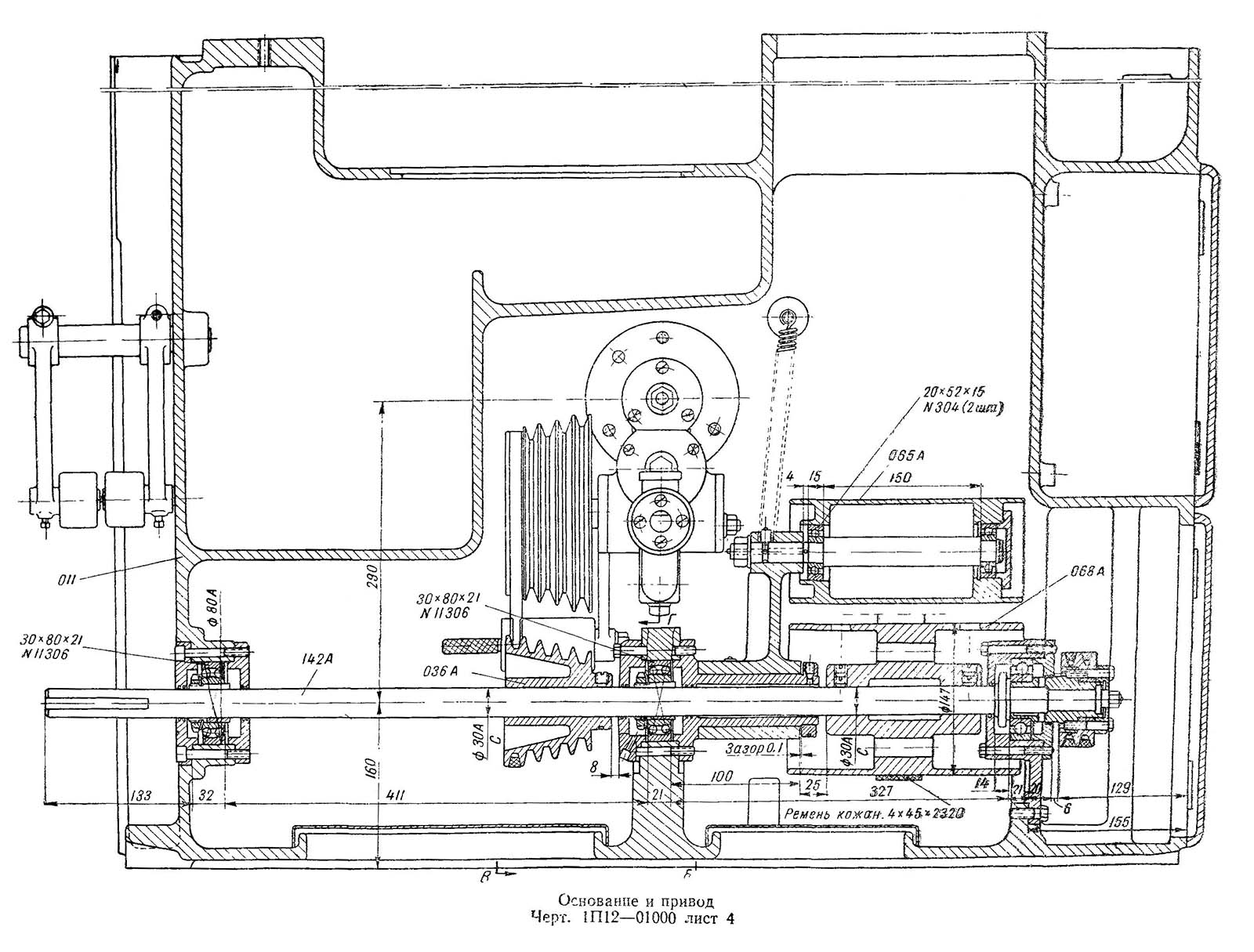 Підстава та привід верстата поздовжнього точення 1П12. Дивитись у збільшеному масштабі