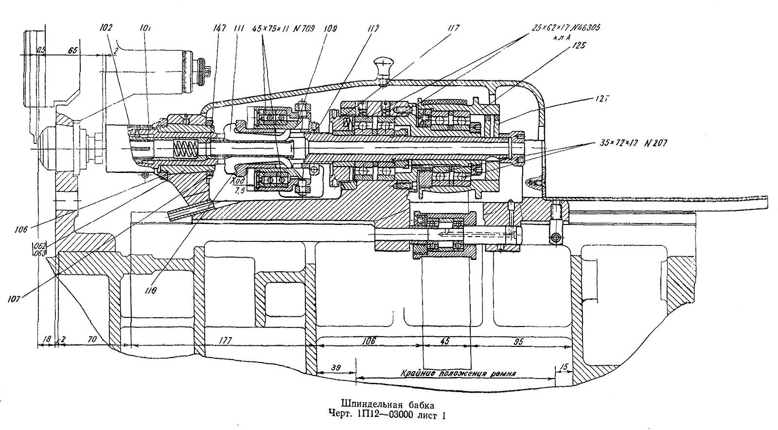 Шпиндельна бабка верстата поздовжнього точення 1П12. Дивитись у збільшеному масштабі