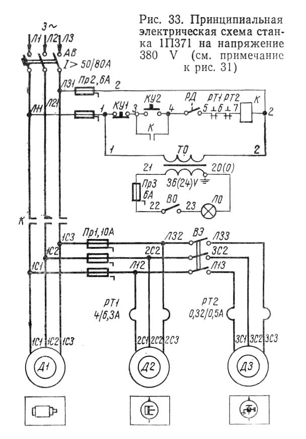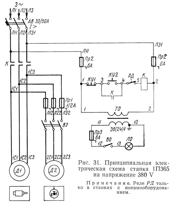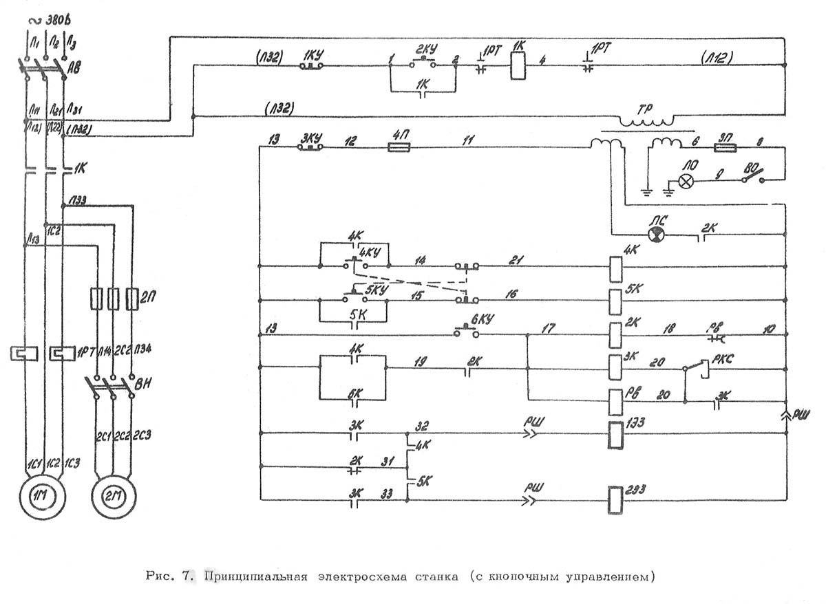 Електрична схема токарного верстата 1п365. Кнопкове керування