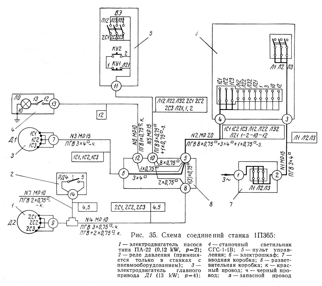Схема з'єднань токарно-револьверного верстата 1п365. Дивитись у збільшеному масштабі
