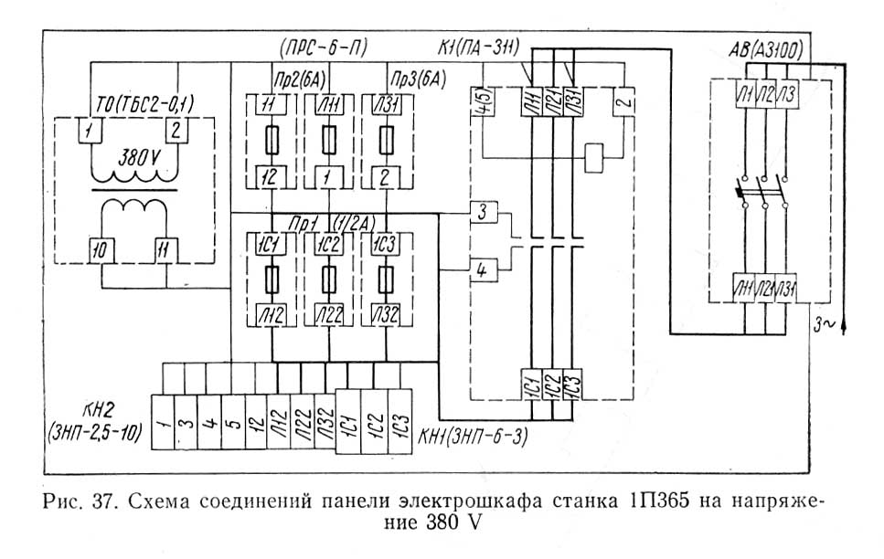 Схема з'єднань електрошафи токарно-револьверного верстата 1п365. Дивитись у збільшеному масштабі