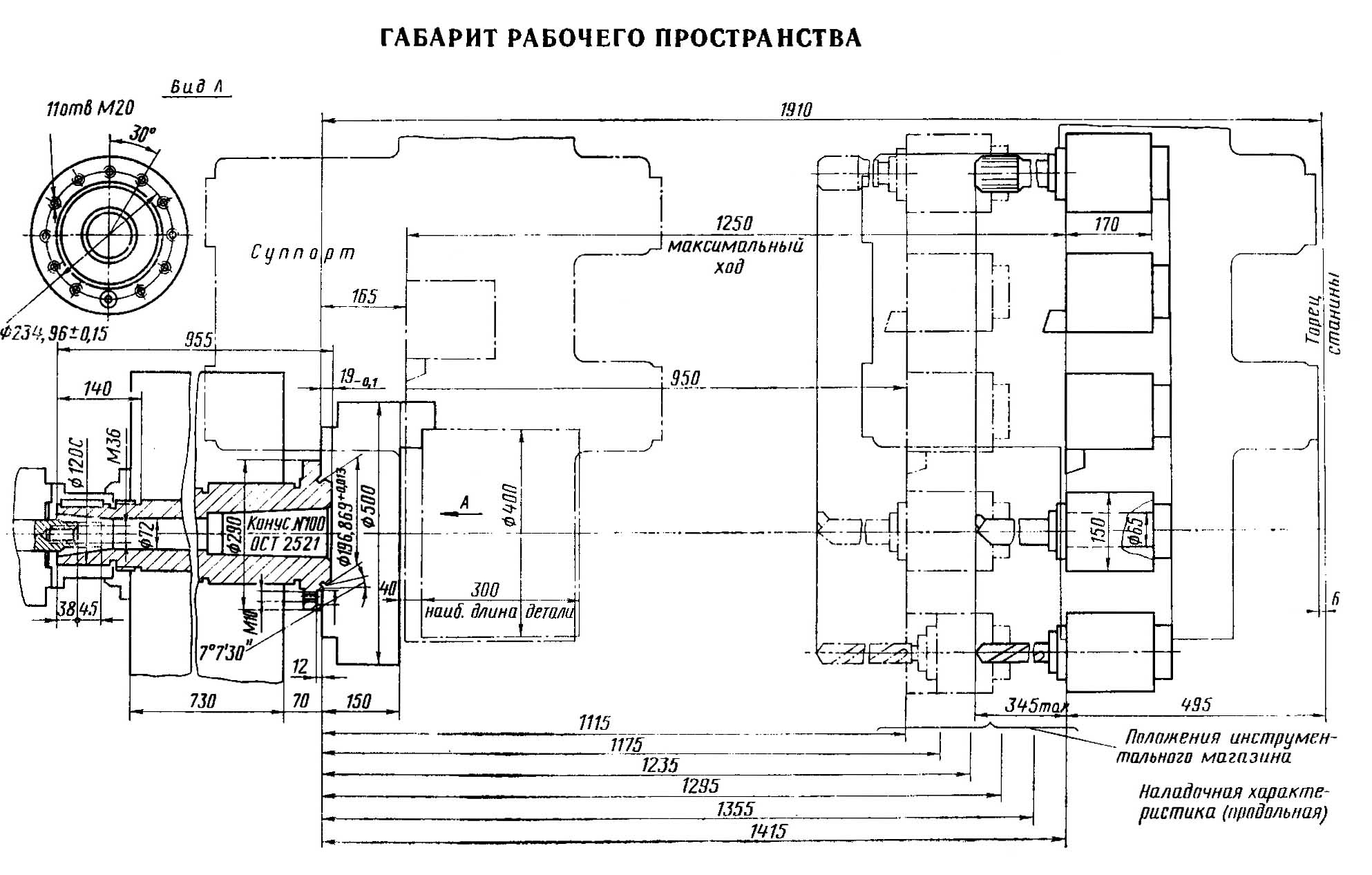 Габаритні розміри робочого простору токарного верстата 1П732РФ3. Дивитись у збільшеному масштабі
