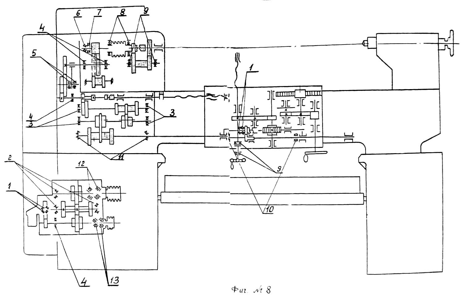 Множительный механізм переключается поворотом рукоятки 7, при етом шестерня 12 перемещает рейку 6, на которой смонтирована вилка переключения блока 5, Множительным механізмом можно пользоваться на ходу верстата. Набор необходимой подачі осуществляется рукоятками 9 і 10, установка которых в различные положения, указанные на табличке коробки подач, з помощью вилок 11 і 13 і блоков 14 і 15 дает нужную подачу на один оборот шпинделя.
