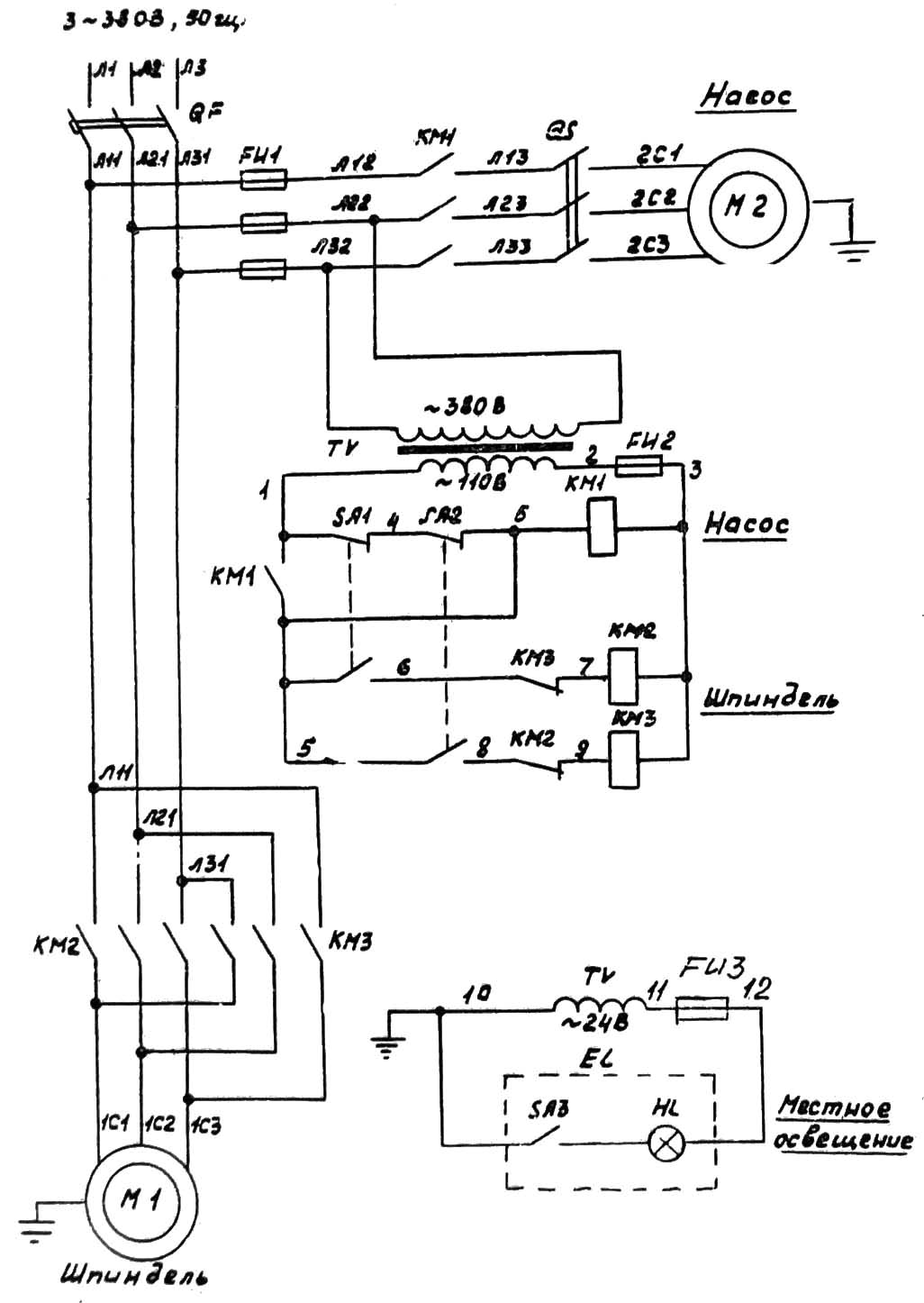 При прямом ходе електродвигуна катушка магнитного пускателя КМ2 получает питание по ланцюги; 5-SA1-6-KM3-7-KM2-3. при обратном — катушка пускателя КМЗ питается по ланцюги 5-SA2-8-KM2-9-KM3-3. Для предотобертання одновременного увімкнення магнитных пускачів КМ2 і КМЗ схемой предусмотрена електрична блокировка, которая осуществляется нормально-закрытыми (Н.З.), блок-контактами магнитных пускачів КМ2 і КМЗ. исключающих увімкнення одного из них при работе другого за счет их размыкания і конечными выключателями SА1 і SA2. Захист от полного исчезновения или чрезмерного понижения напряжения в питающей сети (нулевая защита), а также увімкнення насоса осуществляется магнитным пускателем КМ1 типа ПМЛ-110004.