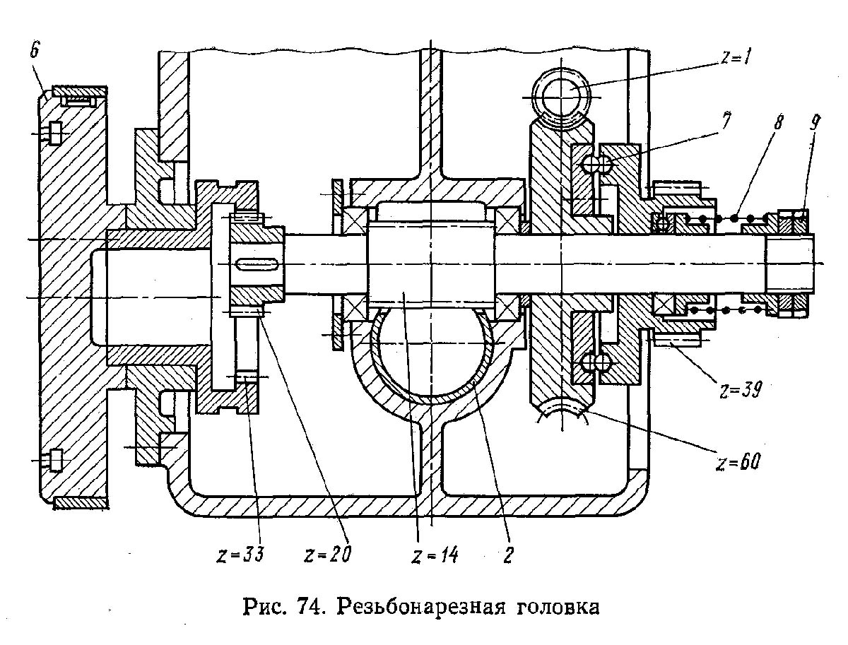 Осевое перемещение шпинделя, согласованное з его вращением, обеспечивается в станке коробкой подач 5 і механізмом подач. Шпиндель верстата смонтирован на шарикопідшипниках в гильзе 2, на наружной поверхности которой нарезана рейка, находящаяся в зацеплении з реечным зубчатым колесом z = 14. Рух к реечной паре передається от зубчатого колеса z = 34, установленного на шлицевой втулке шпинделя в коробке швидкостей, і далее по следующей кінематичної ланцюги: зубчатое колесо z = 30, трехваловая коробка подач з двумя блоками зубчатых колес z = 20—20 і z = 18—27, зубчатая пара (30/30), червячная пара (1/60), предохранительная шариковая муфта 7, зубчатая передача (39/60), сменные зубчасті колеса (a/b) гітари подач, реечное зубчатое колесо z = 14, гильза со шпинделем. Четырехскоростная коробка подач і набор сменных зубчатых колес гітари подач позволяют настроить верстат на нарезание восьми различных шагов різьб в диапазоне 1..3,5 мм.