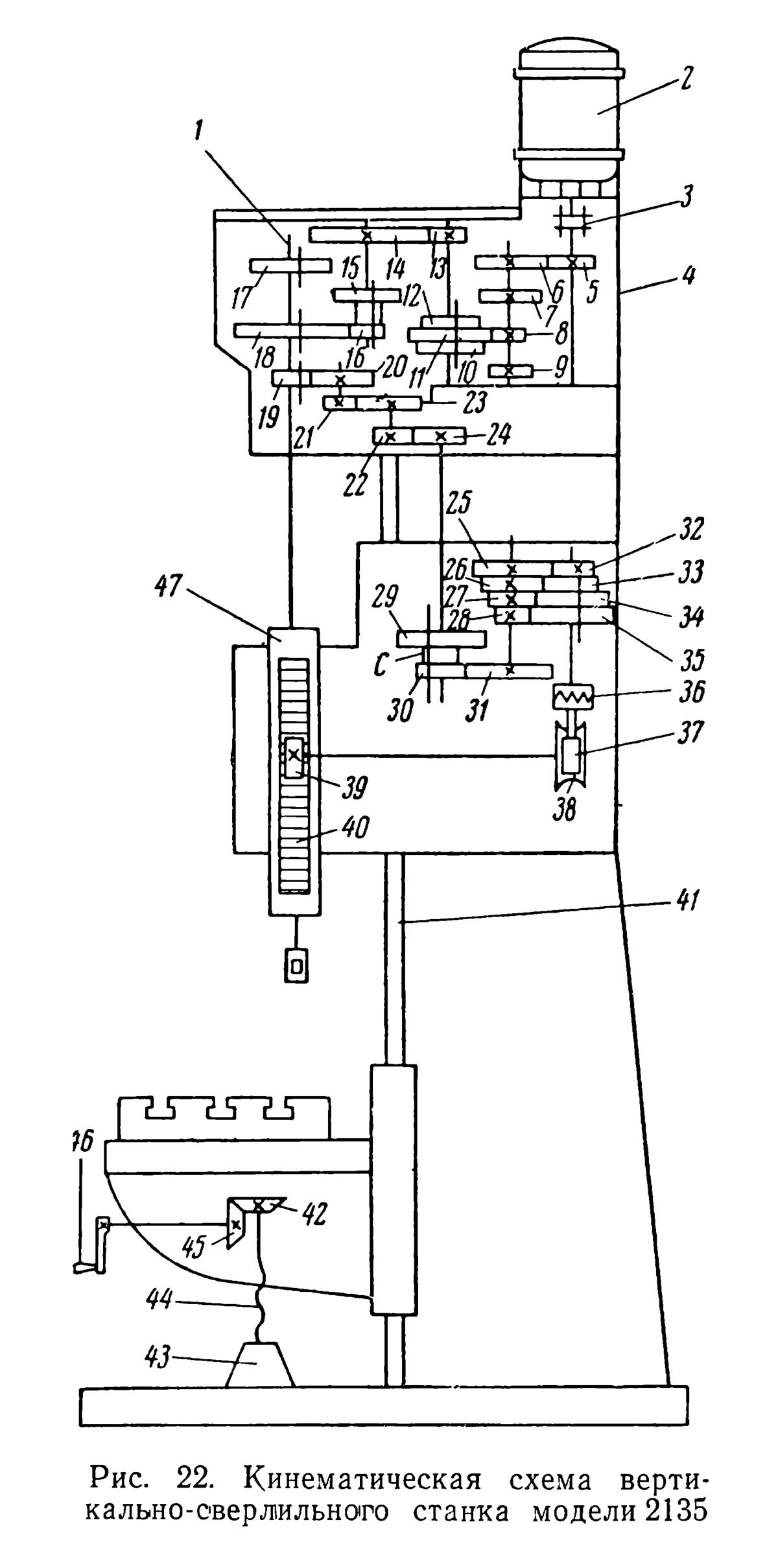 На чугунной плите 11 (рис. 20) установлена вертикальная колонна 10. К (верхней частини етой колонны присоединена коробка швидкостей 4 з индивидуальным електродвигуном 3. Последним валом коробки швидкостей является шпиндель 2, вращающийся в гильзе 22. Опора обертання післядней находится в шпиндельной бабке 21. Гильза 22 вместе со шпинделем 2 може перемещаться в осевом (направлении относительно нерухомою шпиндельной бабки (кронштейна) 21 вручную или механически при помощи приводу подачі.