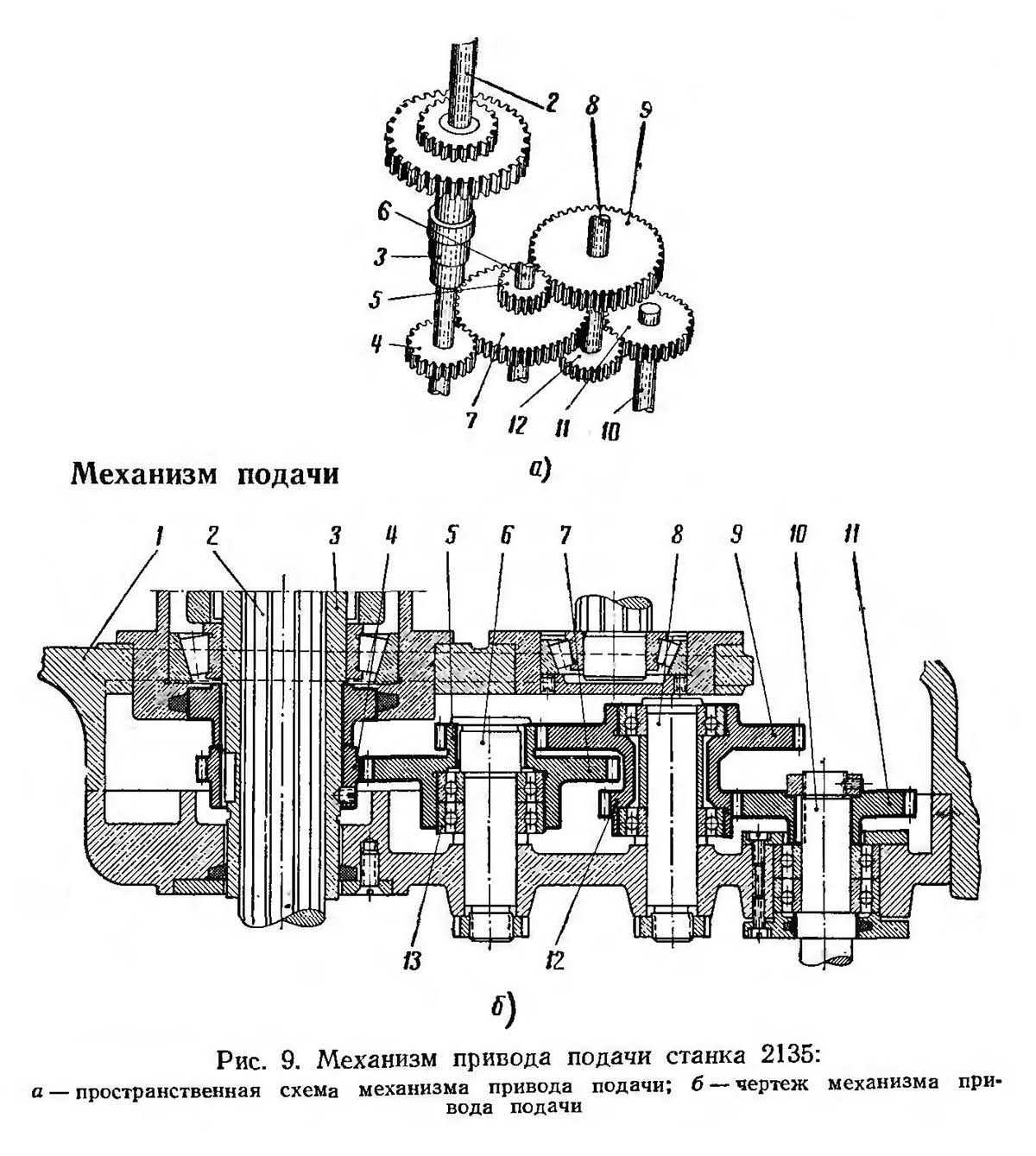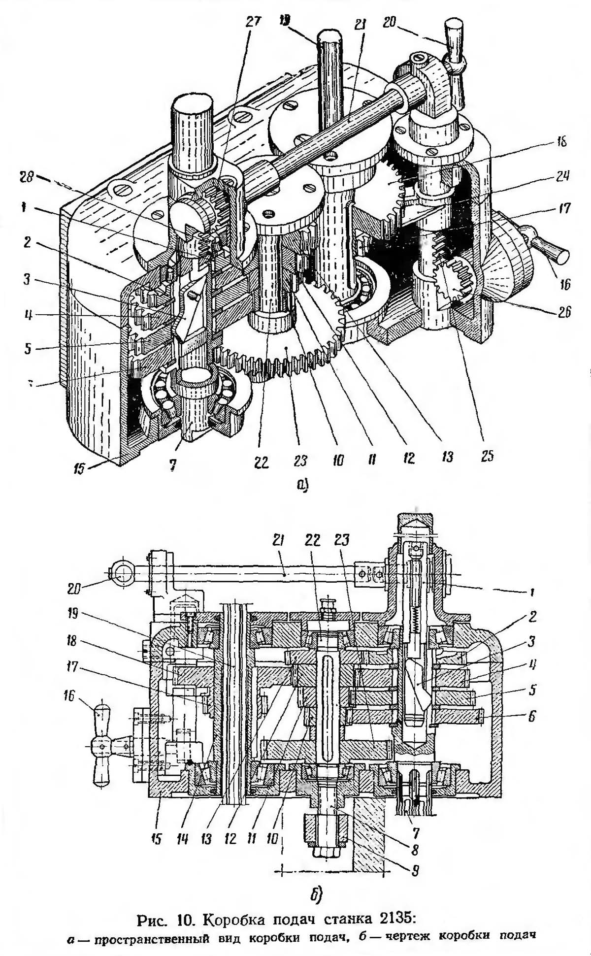 Коробка подач состоит из двухвенцового подвижного колеса 29—30 і двух четырехвенцовых колес з вытяжной шпонкой. При одном рабочем положении двухвенцового колеса 29—30 в зацеплении находятся зубчасті колеса 30—31, а при другом — 29—27. Зубчасті пары 28—35, 27—34, 26—33 і 25—32 находятся в постоянном зацеплении. Передача руху дальнейшим механізмам приводу подачі производится от одной из етих пар в зависимости от того, против какого из колес 32, 33, 34 или 35 установлена вытяжная шпонка. Так как двухвенцовое колесо 29—30 имеет два рабочих положения, а вытяжная шпонка — четыре, то коробка подач дает возможность сообщить шпинделю 2X4 = 8 разных по величине подач: 0,1; 0,145, 0,195; 0,275; 0,4; 0,575; 0,788; 1,11 мм/об.