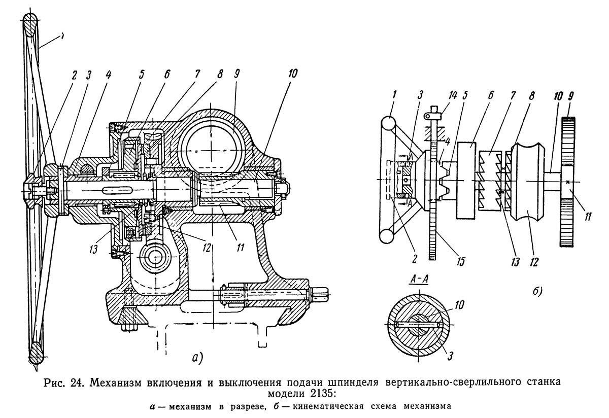 Поворотом штурвала 1 на угол 30° шротов часовий стрелки (валик 10 при етом остается неподвижным) выступы зубьев муфты 4 располагаются против выступов зубьев муфты 5, муфта передвигается вправо вместе з дисками 6 і 7; зубья правой стороны диска 7 входят в зацепление з зубьями диска 8, і вращение червячного колеса 12 сообщается валику 10, реечное колесо 11 перемещает гильзу 9 шпинделя, т. е. выключается механическая подача.