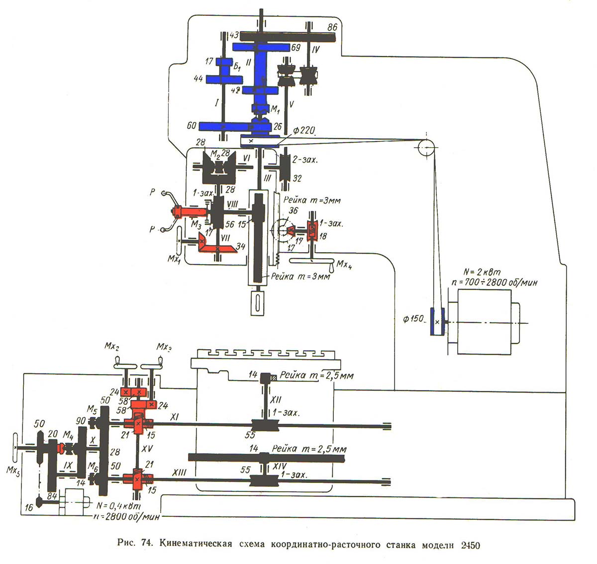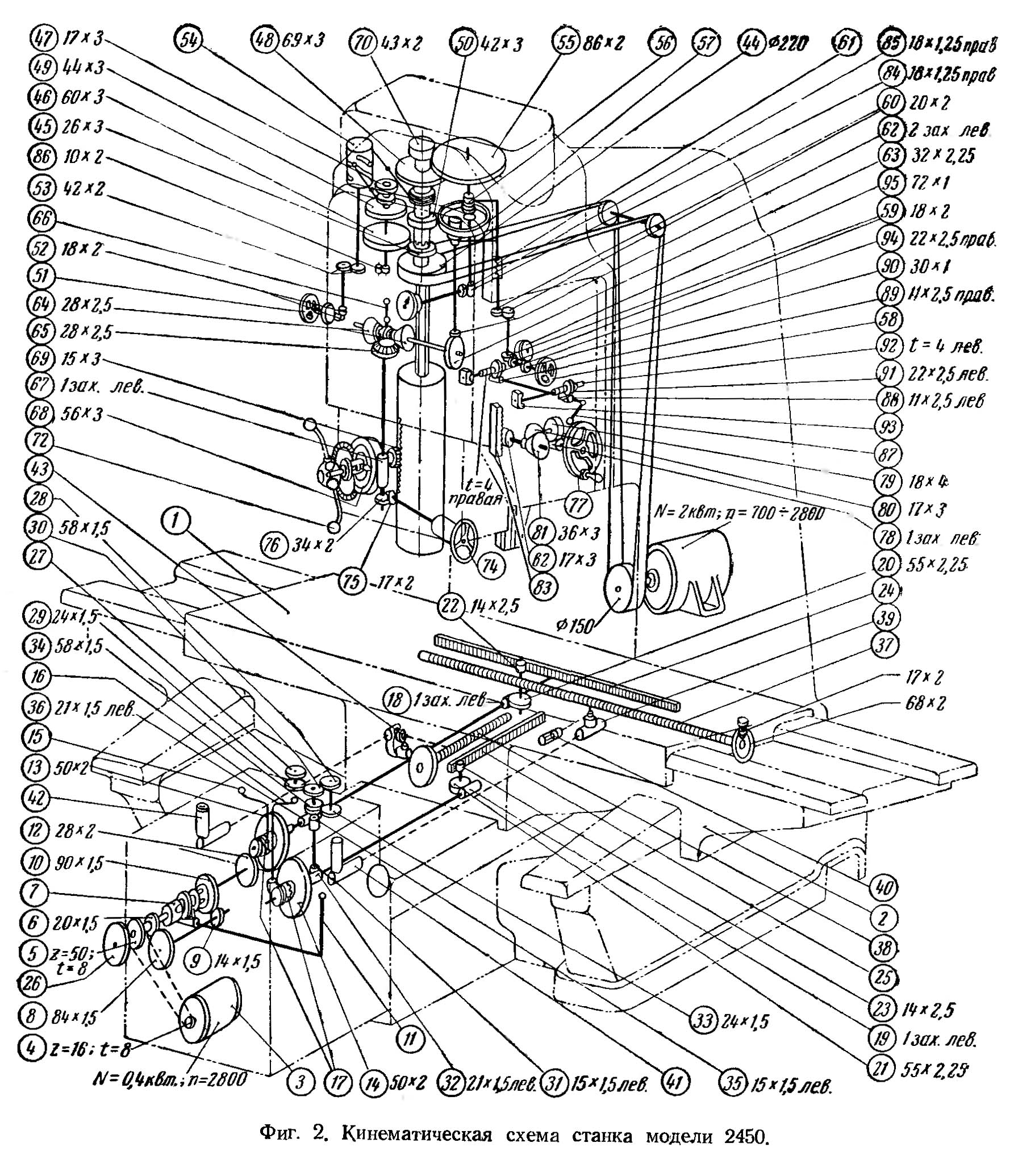2. Кінематична схема координатно-расточного верстата 2450. Дивитись у збільшеному масштабі