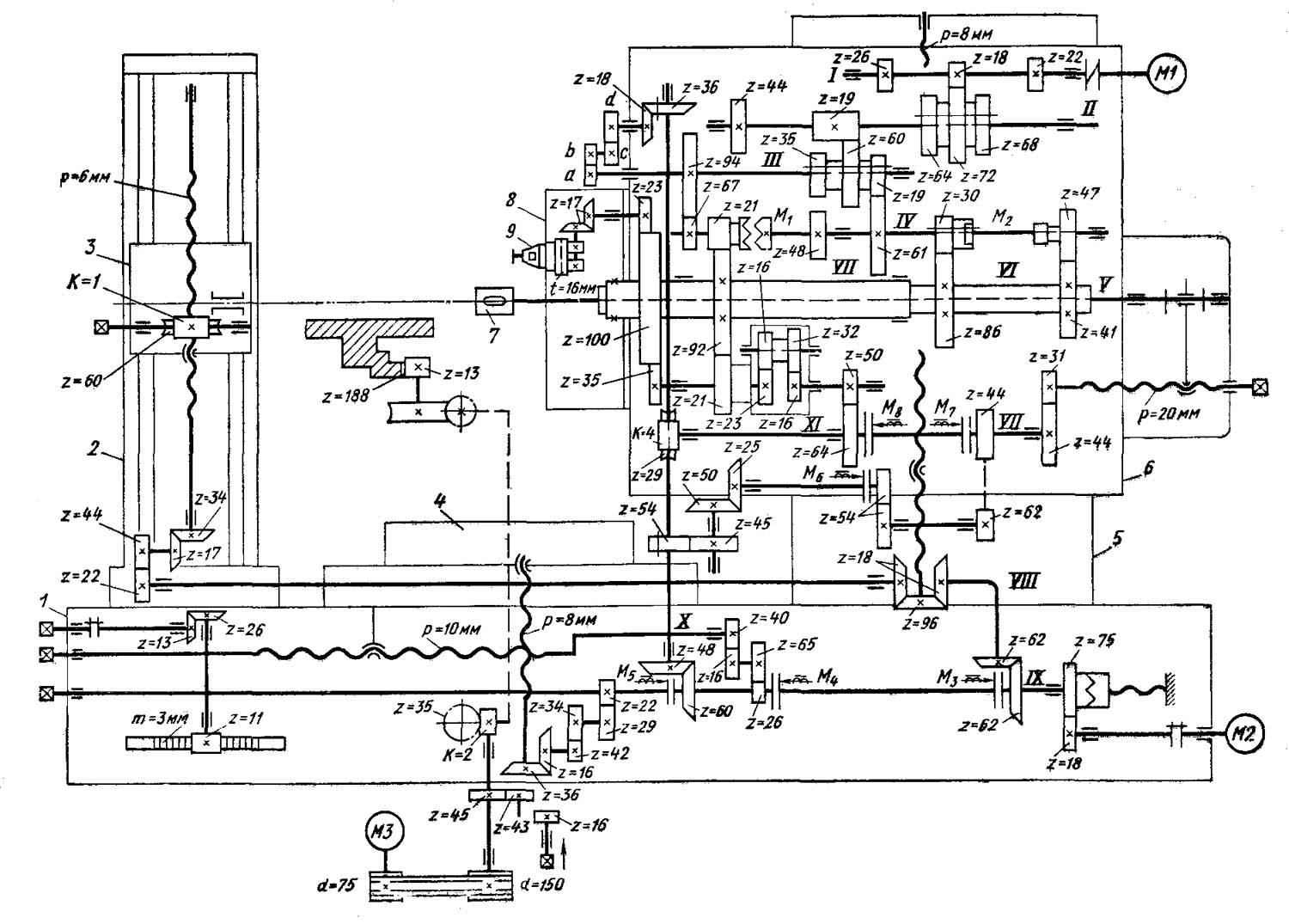 Кінематична схема горизонтально-розточувального верстата 2620В. Дивитись у збільшеному масштабі