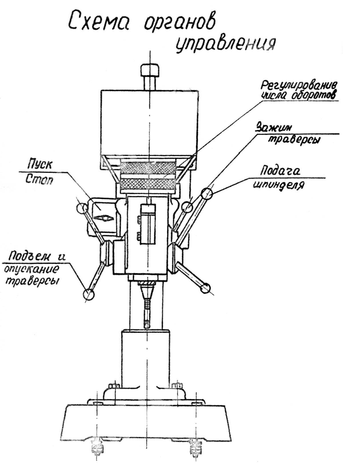 Верстат работает з ручной подачей. Подача осуществляется от рукоятки через реечную шестерню 3, пиноль 2 і радиально-упорный подшипник к ней. Высота шпиндельной бабки устанавливается рукояткой з реечной шестерней 4 і зажимается рукояткой зажиму на колонне.