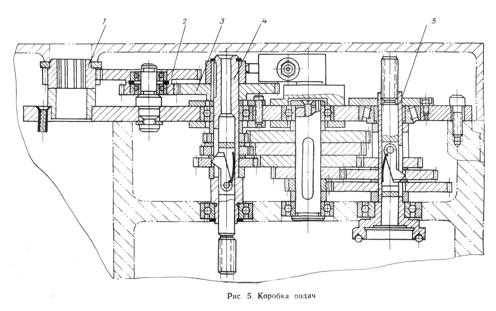 Коробка подач (рис. 5) установлена в корпусе механізма подач. Привід коробки подач осуществляется от шестерни 1, которая сидит непосредственно на шлицах шпинделя і зацепляется з двойной шестерней 2, сидящей на оси. Шестерня 2 передает вращение посредством шестерни 3 двойному конусу 4 з вытяжными шпонками.