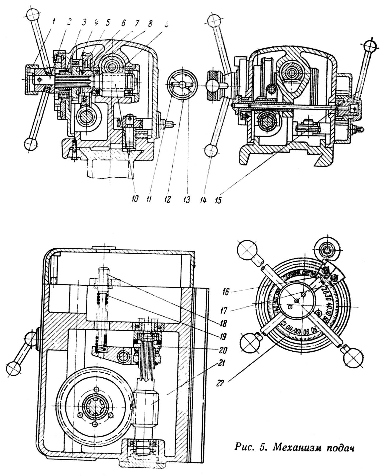 Привід механізма подач осуществляется коробкой подач через кулачковую муфту 1, служащую для виключення механической подачі от кулачка 18, установленного на лимбе 19. Эта же муфта играет роль предохранительного пристроя при перегрузке.