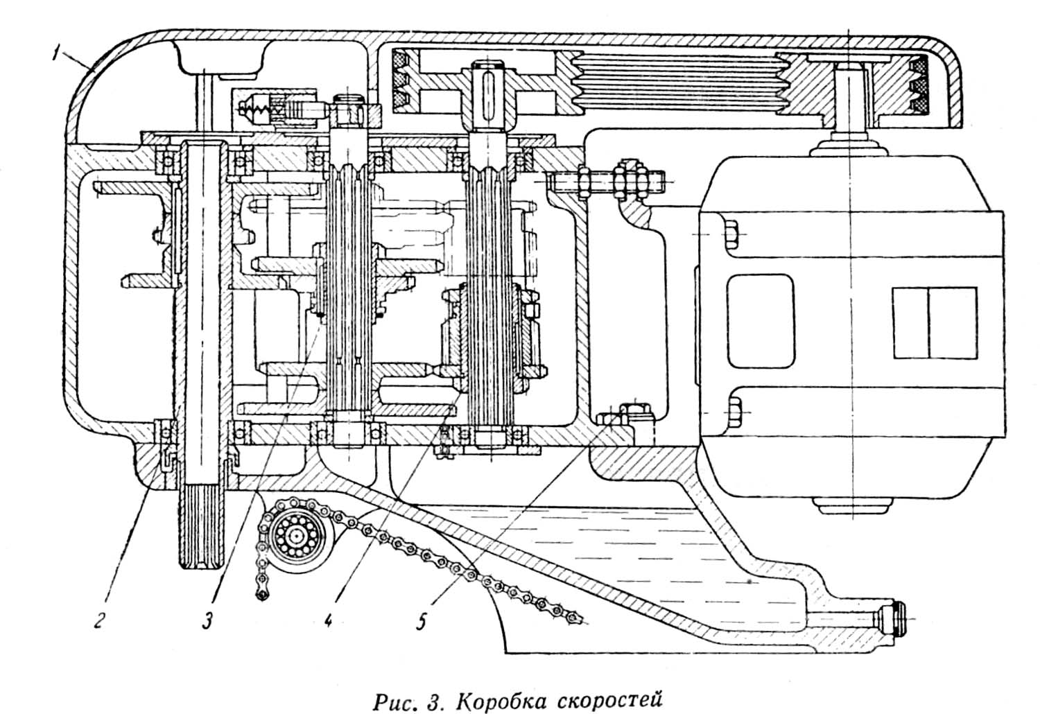 Привід коробки швидкостей осуществляется от вертикально расположенного електродвигуна через клиноременную передачу. Електродвигун укреплен на кронштейне, который може перемещаться вдоль оси коробки, что обеспечивает натяжение ремня. Зажим кронштейна в любом положении осуществляется затяжкой двух болтов 1.