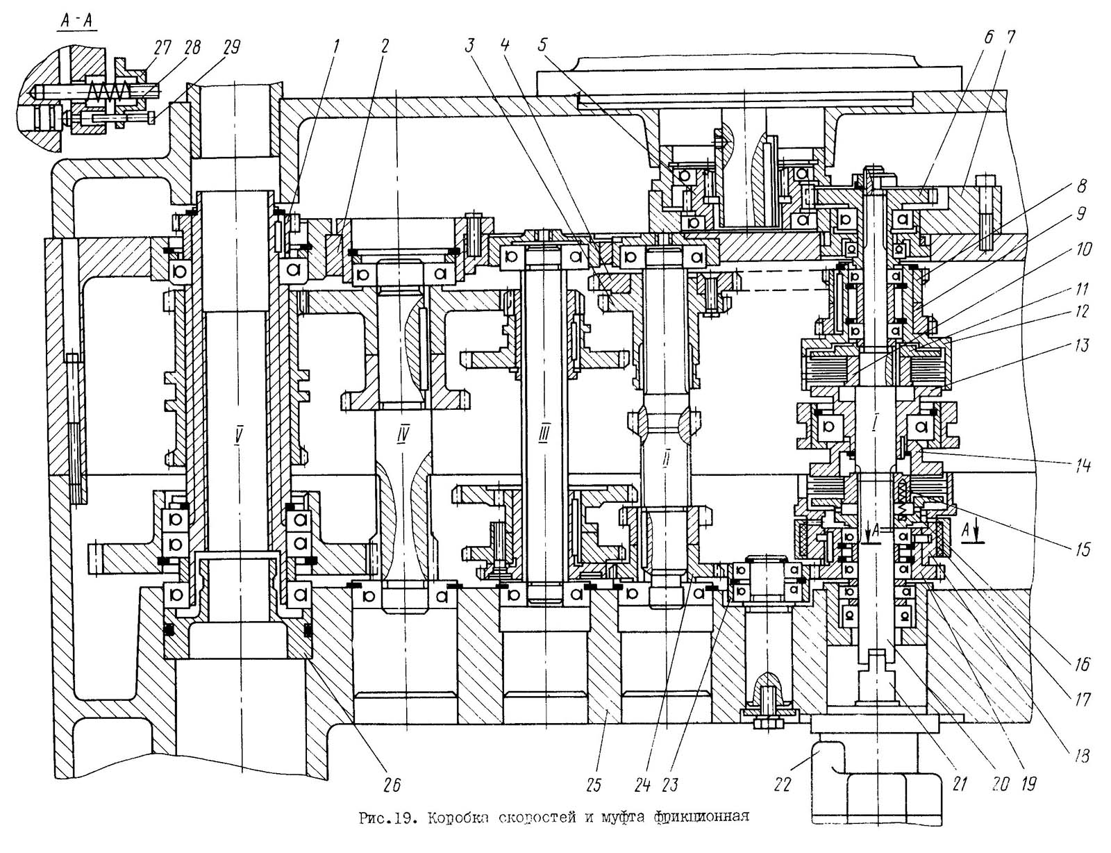 В ланцюги приводу шпинделя между головним електродвигуном і коробкой швидкостей расположена фрикционная муфта (рис. 19), которая предназначена для увімкнення обертання і реверсирования шпинделя, а также для предохранения елементів приводу от перегрузки. Муфта является, кроме того, важным звеном системы преселективного керування переключением частоти обертання і подач. Узел фрикционной муфты состоит из двух муфт - верхней, обеспечивающей прямое вращение шпинделя, і нижней - для обертання шпинделя в обратном направлении. Обе муфты собраны на одном валу 20.