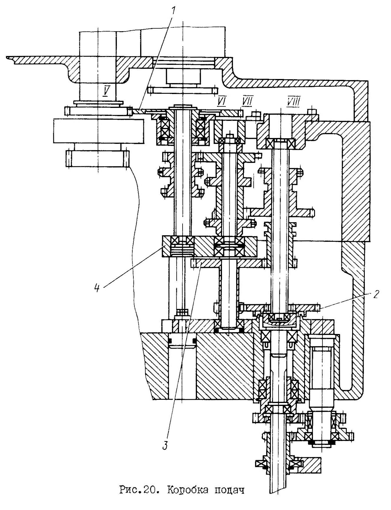 Коробка подач (рис.20) расположена между шпинделем і механізмом подачі і получает вращение от шпинделя через зубчатое колесо I, сквозь шлицевое отверстие которой пропущен вал УI. Нижними опорами валов УI і УII служат гнезда, расположенные в промежуточной плите 4. Нижня опора вала УШ расположена в расточке зубчатого колеса 2. Верхние опори валов расположены в гнездах, установленных в отверстиях крышки сверлильной головки. На валу УП расположено переборное зубчатое колесо 3. В зоне механізма подачі (под коробкой подач (см. рис.21) располагается дополнительная переборная группа. Все зубчасті колеса коробки подач изготовлены из качественной стали, а их зубчасті венцы термически обработаны.
