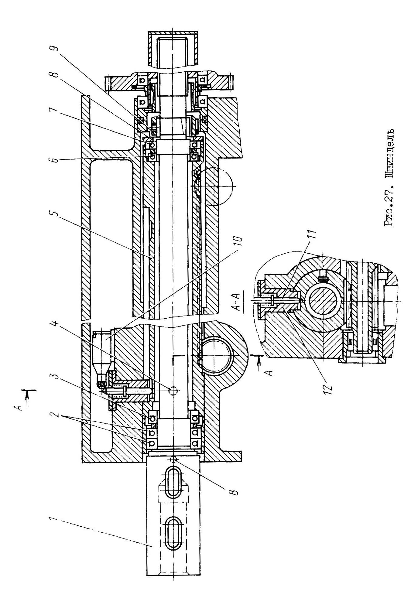 Шпиндель I (рис.27) верстата размещен в выдвижной пиноли 5. В передньої (нижней) опоре кроме двух радиальных підшибників 2 установлен упорный подшипник 3, воспринимающий осевую нагрузку при сверлении. Задня (верхняя) опора состоит из радиального підшипника 7 і упорного підшипника 6. Последний служит для восприятия осевых нагрузок при обратных подрезках і других аналогичных операциях.