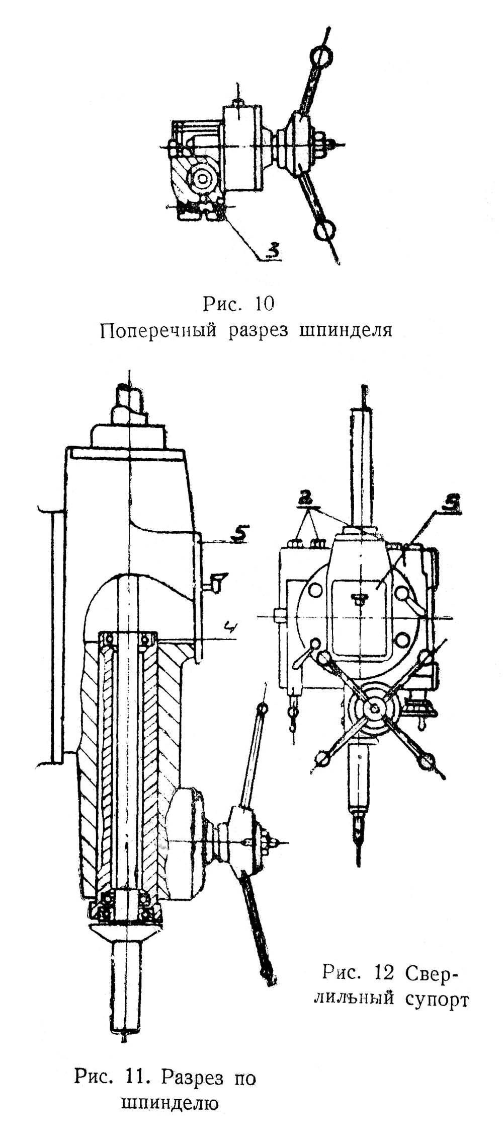 Регулювання зношування гільзи шпинделя проводиться підгвинчуванням гвинтів 3. Регулювання осьового люфта шпинделя проводиться підгортанням гайок 4; попередньо має бути знято кришку 5.