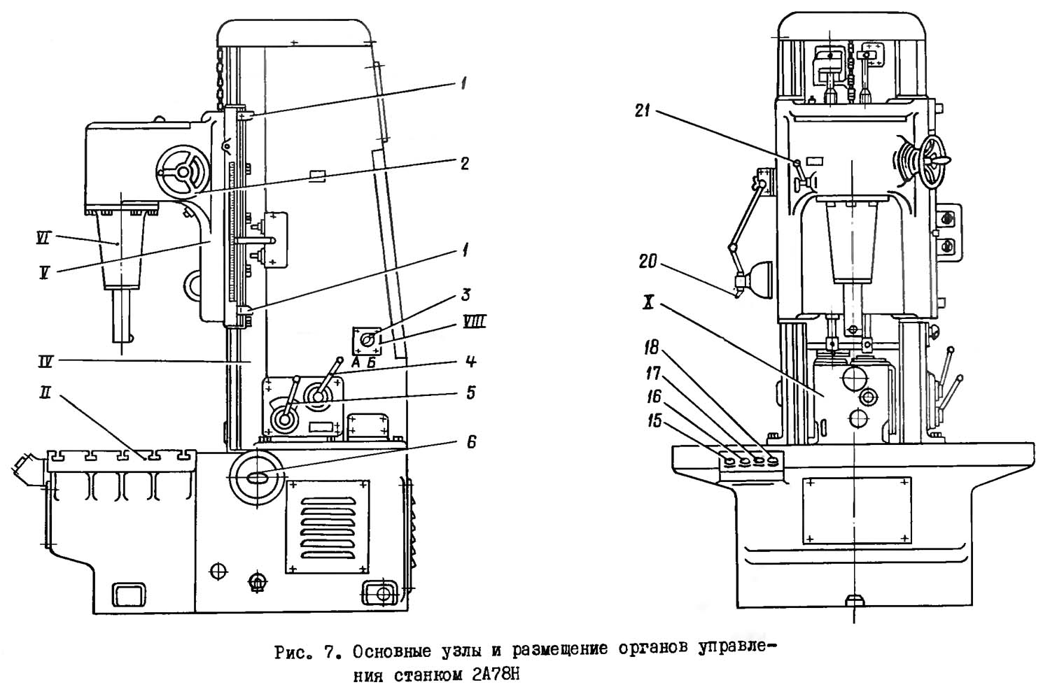 Основание верстата 2А78 имеет направляющие, по которым перемещается подвижный стол (узел 18). Основание верстата 2А78Н выполнено за одно целое со столом, имеющим Т-образные пазы.
