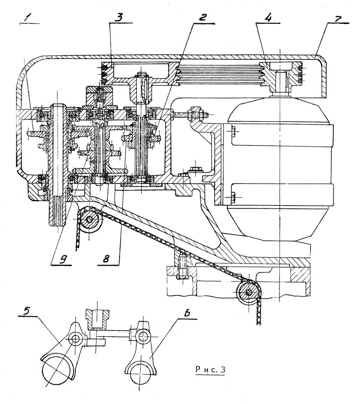Через шестерні 4, 7, що сидять на другому валу, обертання передається третьому валу, на якому знаходиться подвійний блок шестерень 8 і 9.