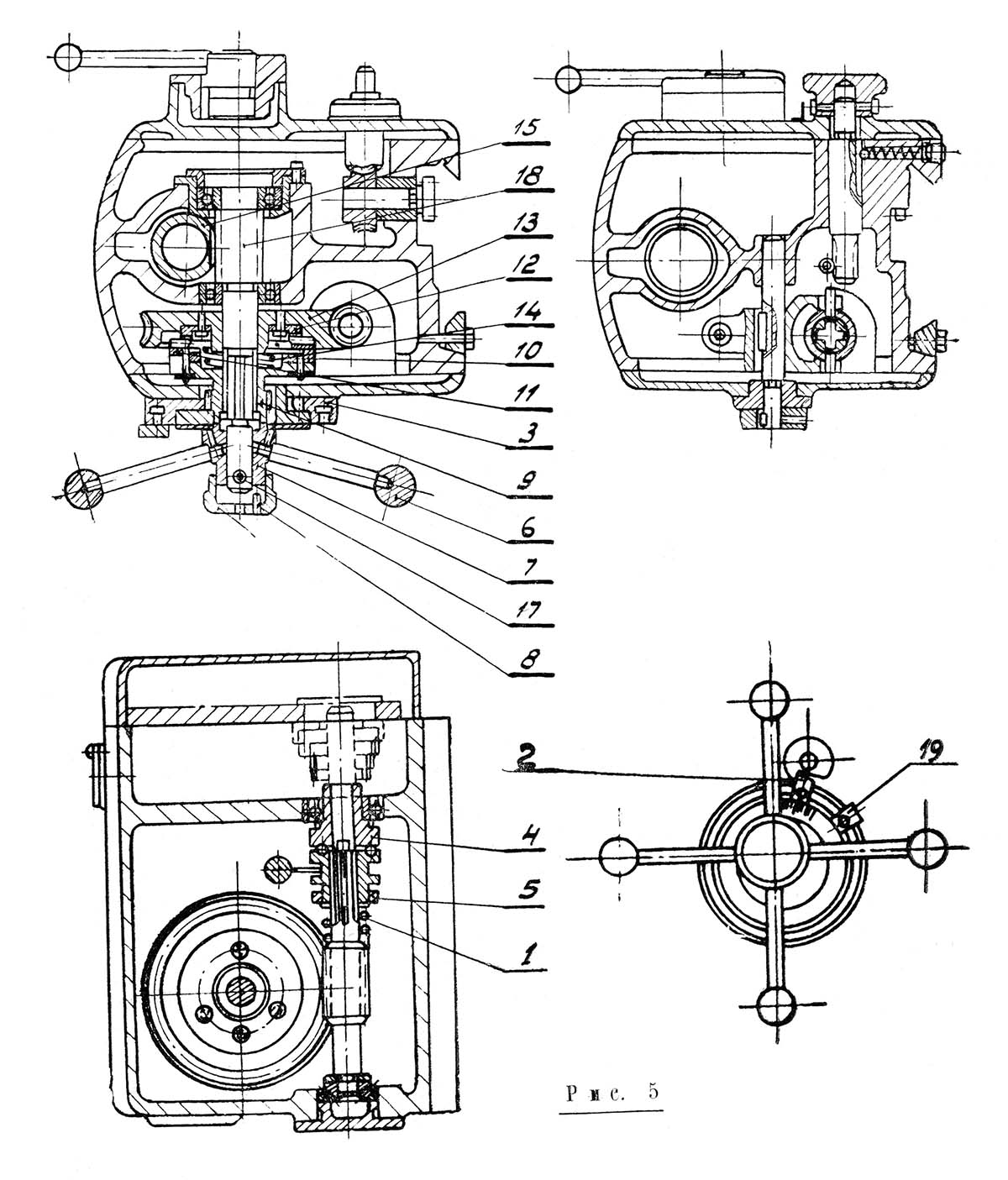 Корпус механізма (см. рис. 5) подач представляет собой жесткую чугунную отливку, внутри которой кроме механізма подач находится шпиндель і коробка подач. Механізм подач приводится в рух коробкой подач через муфту (1), служащую для виключення механической подачі от кулачка (2), установленного, на шестерне лимба (3). Эта же муфта играет роль предохранительного пристроя при перегрузке по усилию подачі. С помощью гвинта (4) і пружины (5) муфта настраивается на вимкнення (прощелкивание) при усилии подачі на 10 процентов превышающем номинальные, т. е. 600 кг.