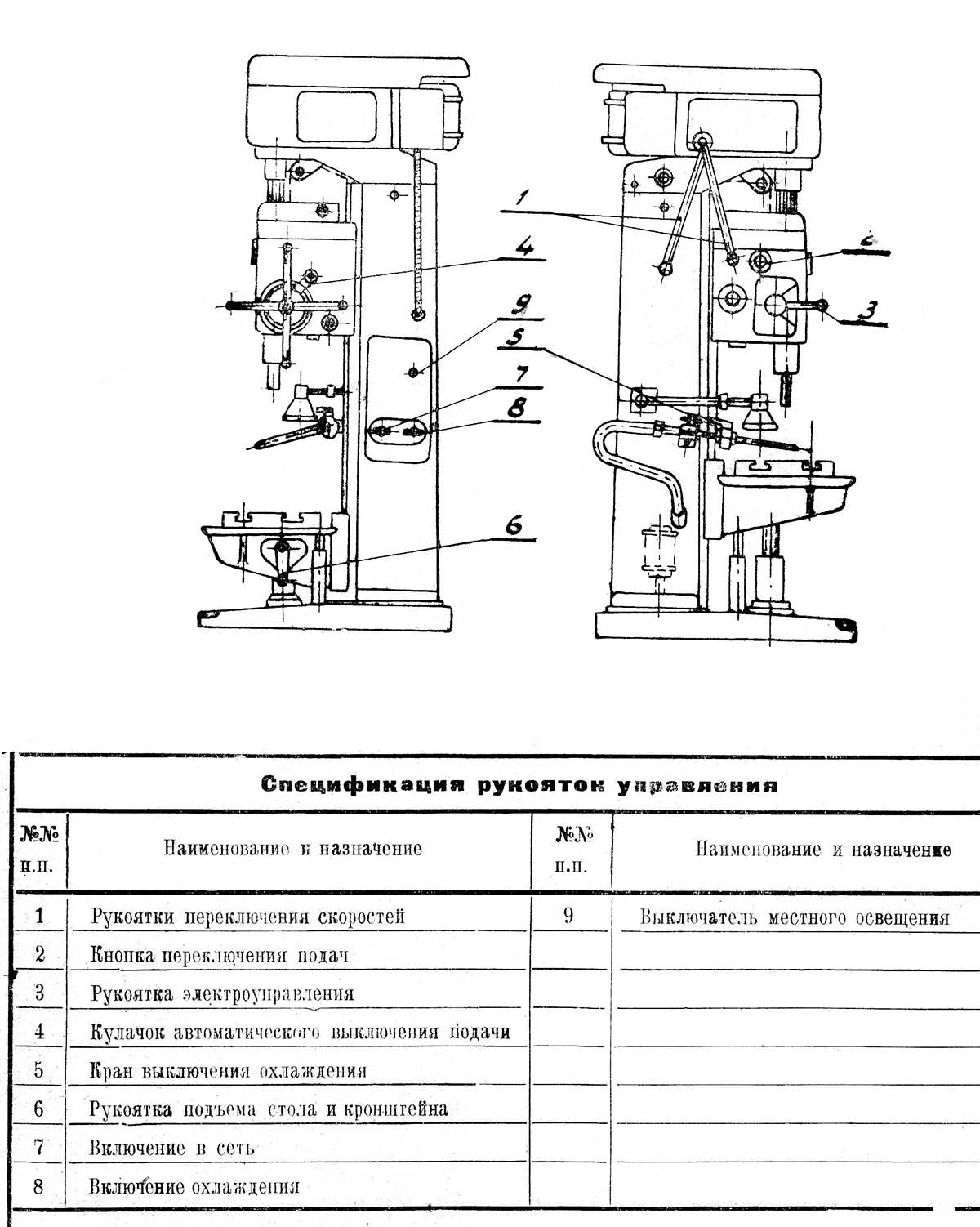 Розташування органів керування свердлильним верстатом 2Б118. Дивитись у збільшеному масштабі