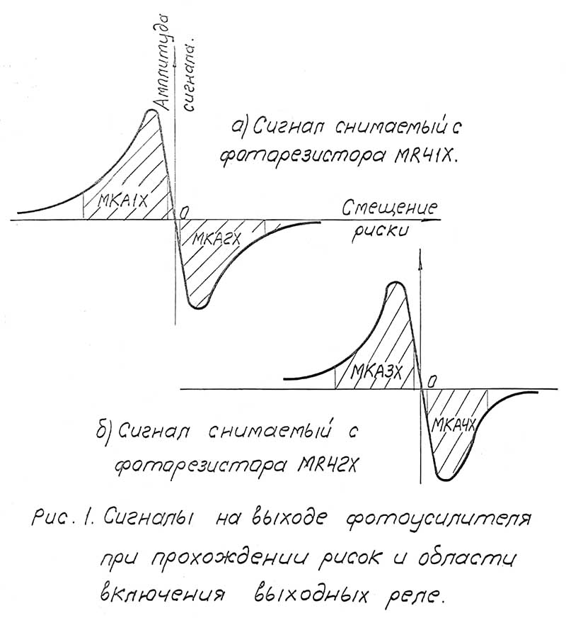 При отсутствии изображения риски в поле зрения фоторезистора на выходе фотоусилителя наблюдается синусоидальный сигнал з частотой 100 Гц, вызываемый пульсацией светового потока лампы подсветки оптики. При появлении риски в поле зрения фоторезистора в сигнале появляется составляющая з частотой 50 Гц . При перемещении риски амплитуда етой составляющей сперва растет, достигает максимума, а затем резко спадает до нуля в тот момент, когда риска располагается симметрично относительно оси колебаний фоторезистора.