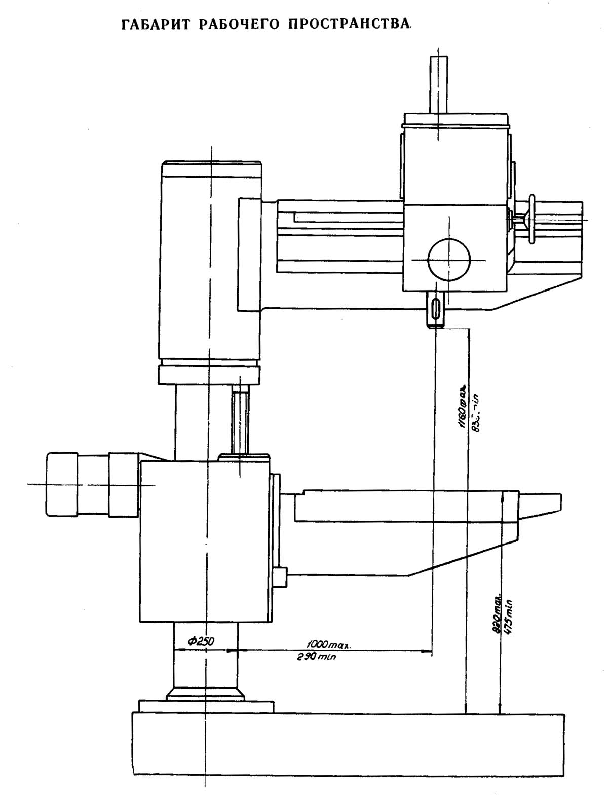 Габарит робочого простору радіального свердлувального верстата 2Л53. Дивитись у збільшеному масштабі