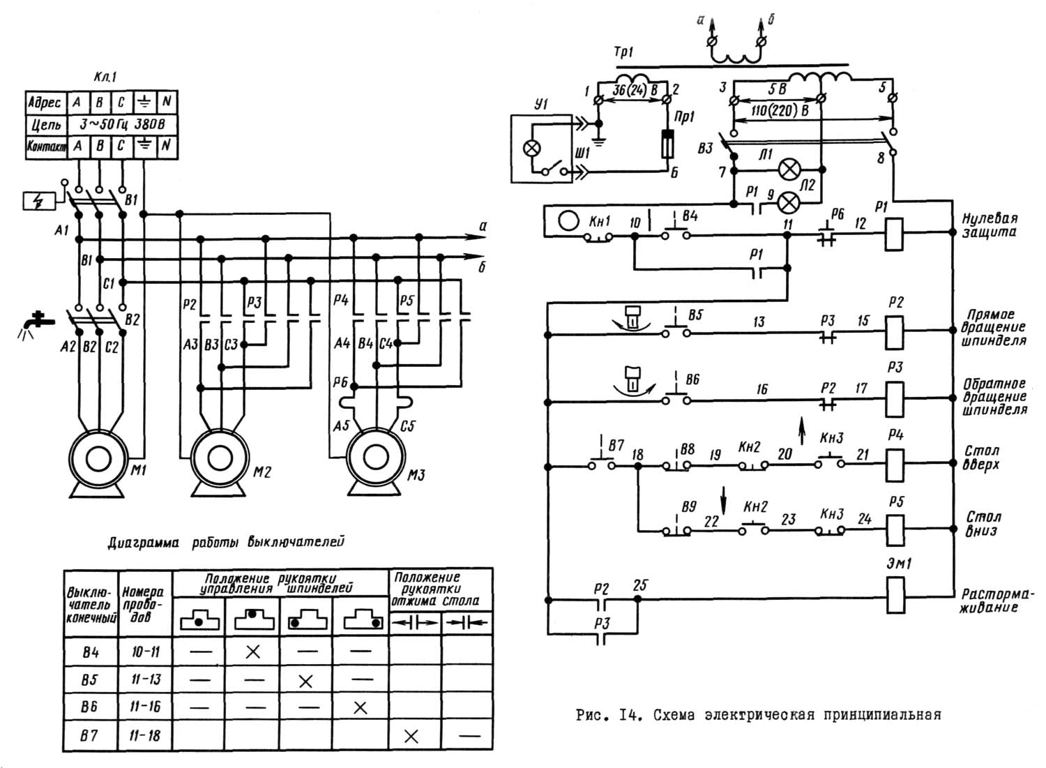 На бочке находятся конечные выключатели ограничения переміщення бочки со столом В8, В9 і конечный выключатель В7, сблокированный з рукояткой зажиму бочки. На сверлильной головке размещен копандоаппарат, состоящий из трех микровыключателей: