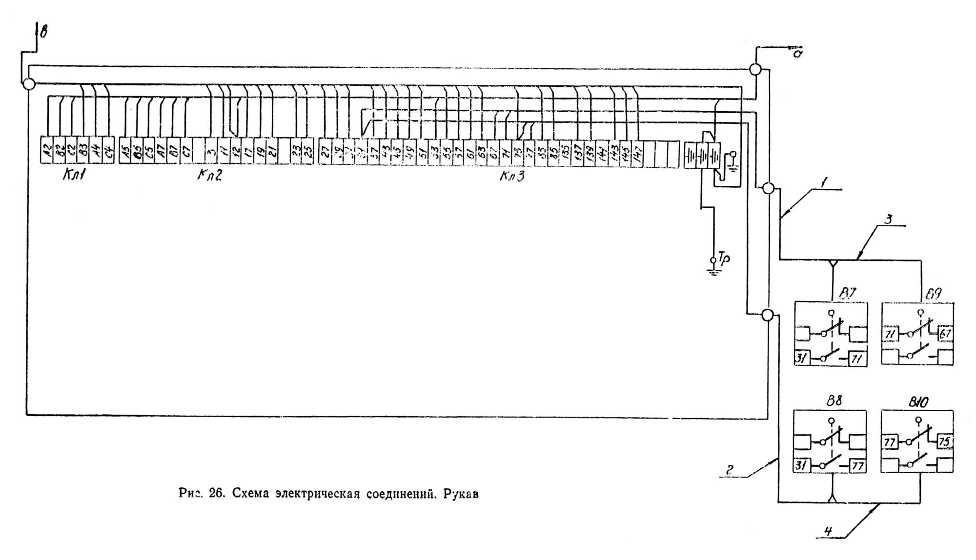 Подъем рукава прекращается нажатием на кнопки Кн7 или Кн1. В крайнем верхнем положении рукав останавливается от воздействия упора на конечный выключатель В9.