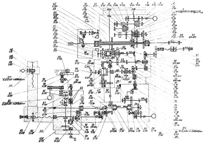 Схема кінематична горизонтально-расточного верстата 2М614. Дивитись у збільшеному масштабі