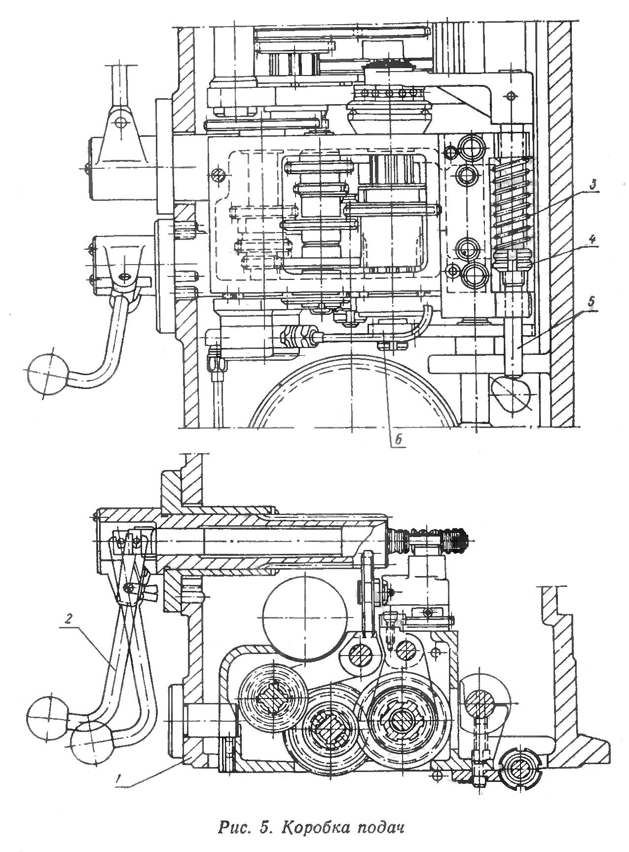 Коробка подач (рис. 5) представляет собой трехваловый механізм, смонтированный в отдельном литом корпусе 1. Шесть подач обеспечиваются при помощи тройного блока шестерен 10 і двойного блока шестерен 13.