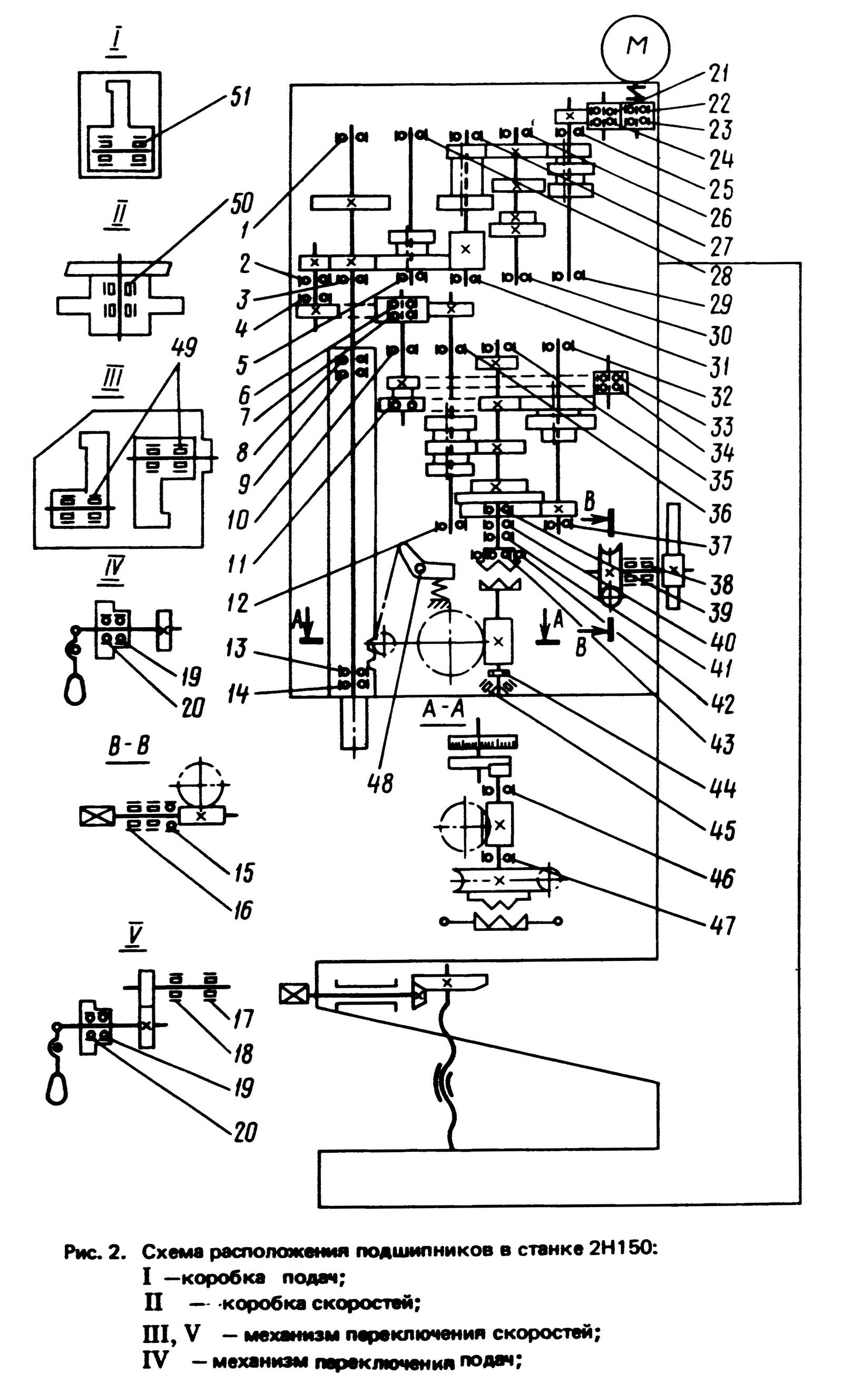 Схема розположення підшибників сверлильного верстата 2Н150. Дивитись у збільшеному масштабі