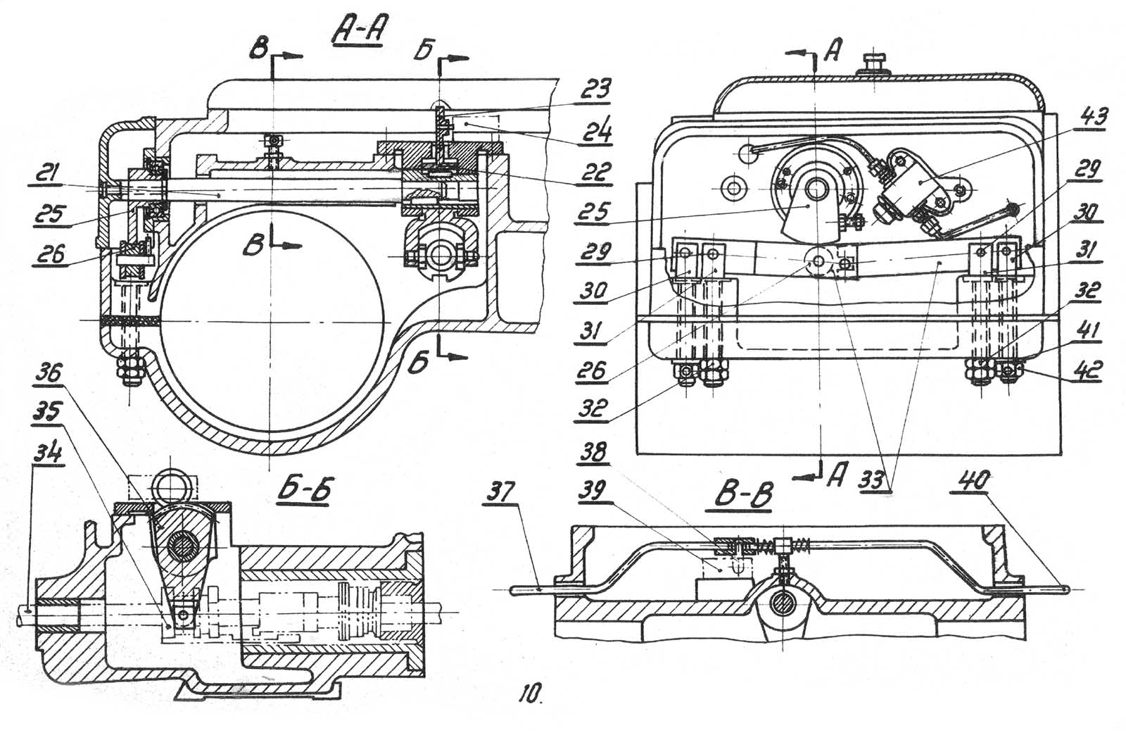Барабанный переключатель 39 останавливает електродвигатель механізма подъема в крайних положениях рукава.. При достижении крайнего верхнего положения штанга 40 упирается в корпус механізма подъема і поворачивает кулак 38 переключателя, разрывая електрическую ланцюг. В крайнем нижнем положении штанга 37, упираясь в колонну, поврачивает тот же кулак, выключая електродвигатель.