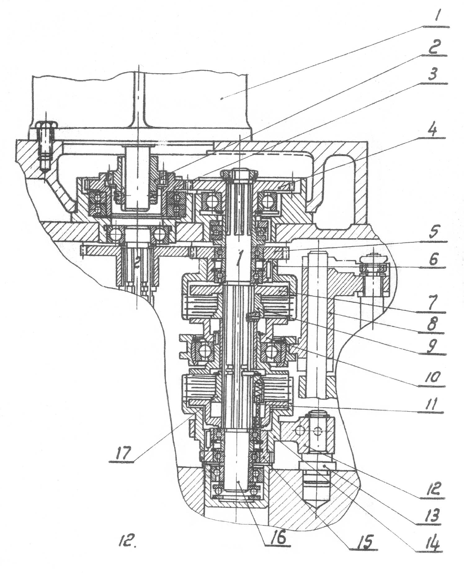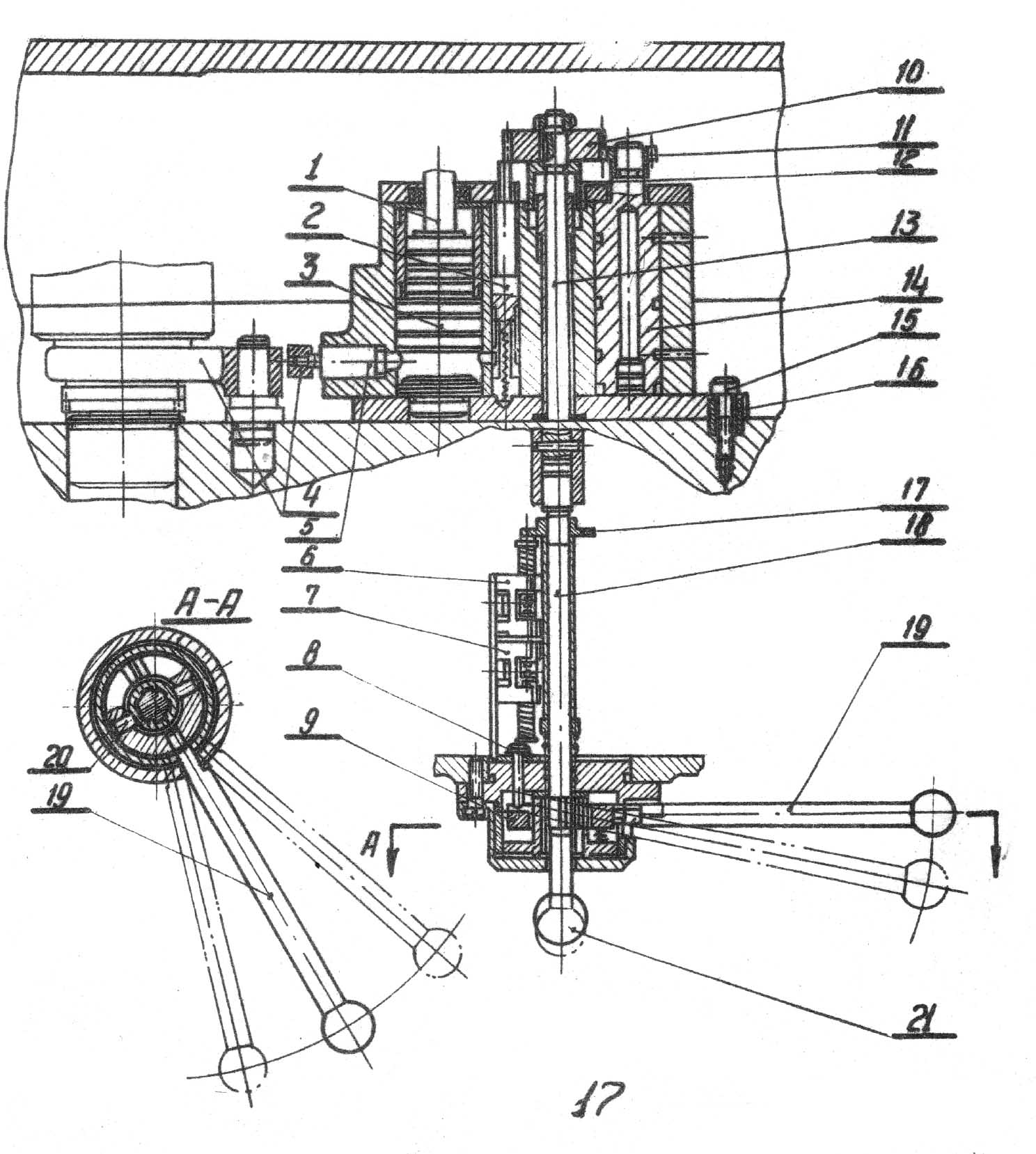 В зацеплении з зубчатым венцом гайки-шестерни 7 находятся: рабочий плунжер 21 і вспомогательный плунжер 22. Весь механізм смонтирован в корпусе 17, который соединен з корпусом 11 гвинтами 8. Полый винт З вверху имеет венец, который связан з внутренним зубчатым венцом фланца 2. Последний гвинтами 1 связан з крышкой 5, а через нее з корпусом 17.