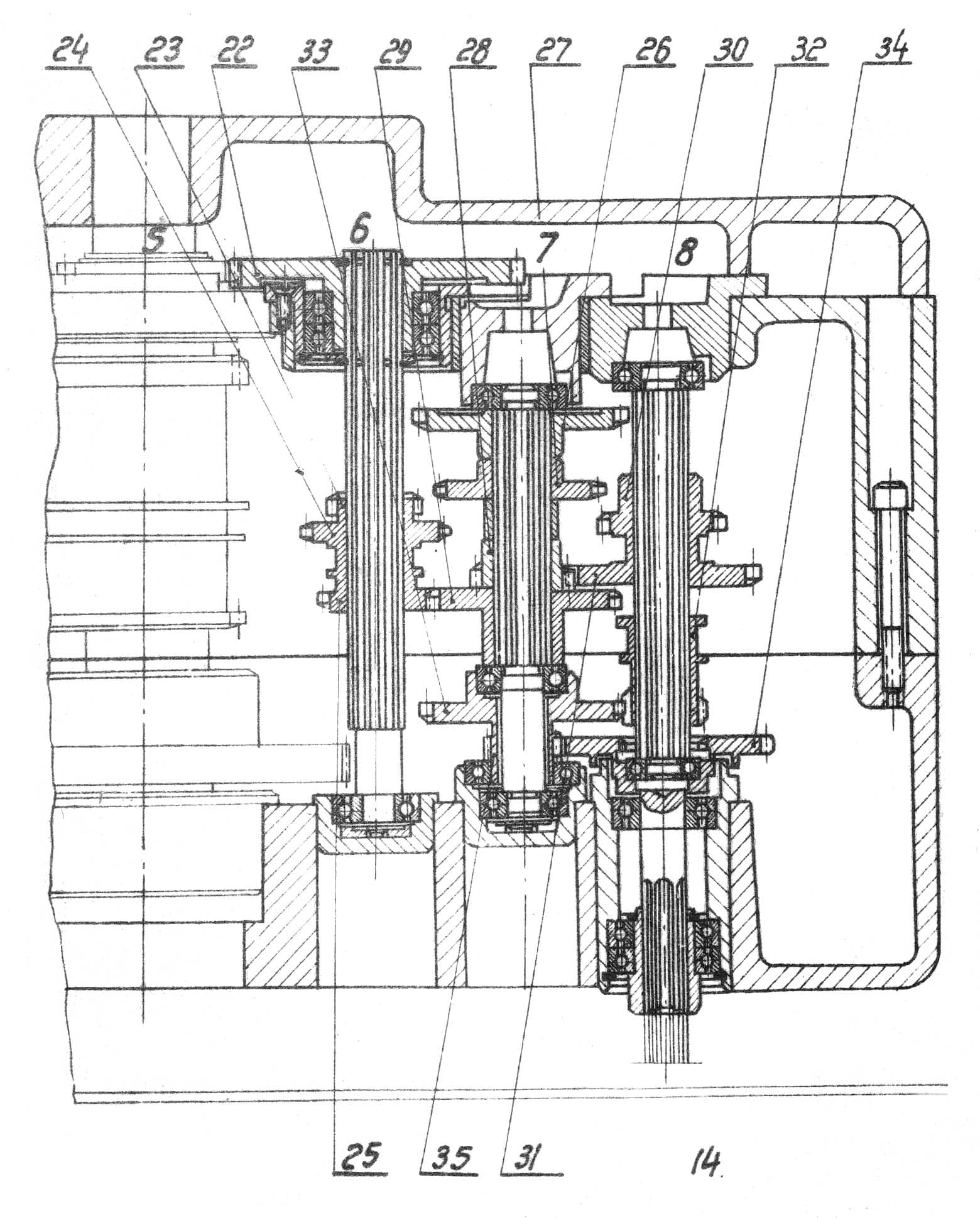 Коробка подач получает вращение от шпинделя через шестерни 21 і 22. Один тройной і два двойных блока обеспечивают получение 12 подач, образующих геометрический ряд з φ =1,41 в интервале от 0,056 до 2,5 мм/об.