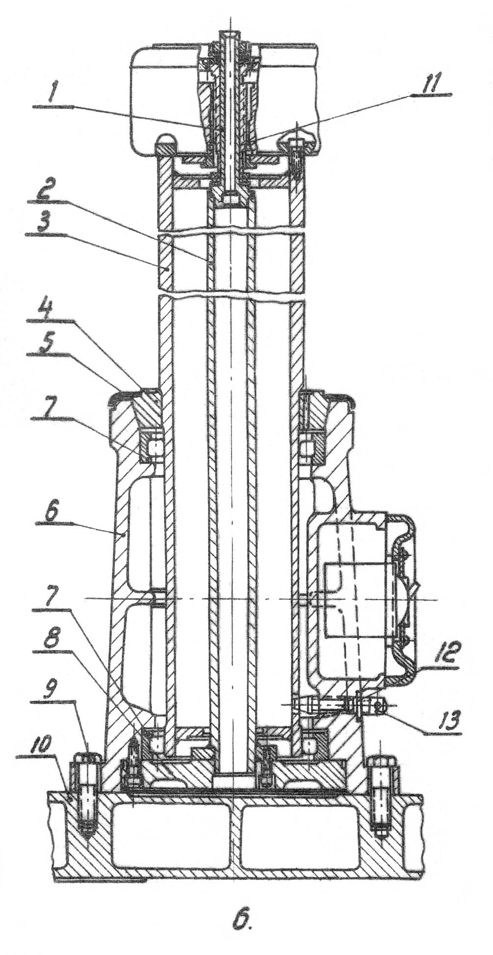 Стойка 2 прочно соединена з цоколем 6 з помощью фланца 8. В верхней частини к стойке 2 приварен стержень 1, который проходит внутри гвинта механізма зажиму 11 і соединяется з ним гайкой. Таким образом, стойка 2 со стержнем 1 соединяет узел механізма зажиму колонны з цоколем і воспринимает вес поворотных частин верстата при освобождении зажиму колонны (колонна 3 з конусным кольцом 4 приподнимается относительно цоколя), а при зажиме - воспринимает продольное усилие, развиваемое механізмом зажиму 11.