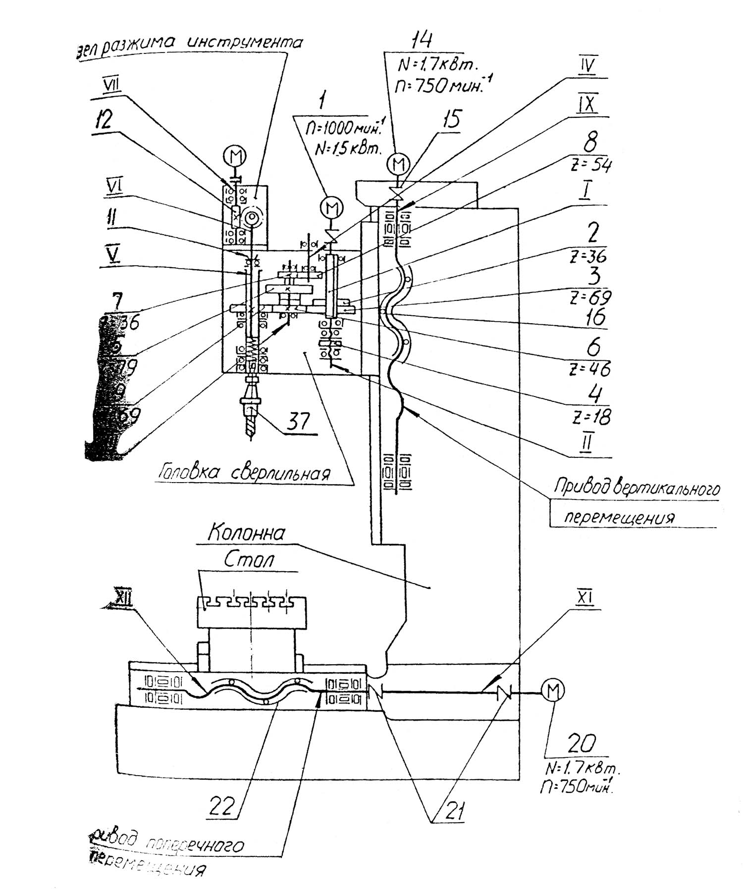Кінематична схема сверлильно-фрезерного вертикального верстата 2с150пмф4