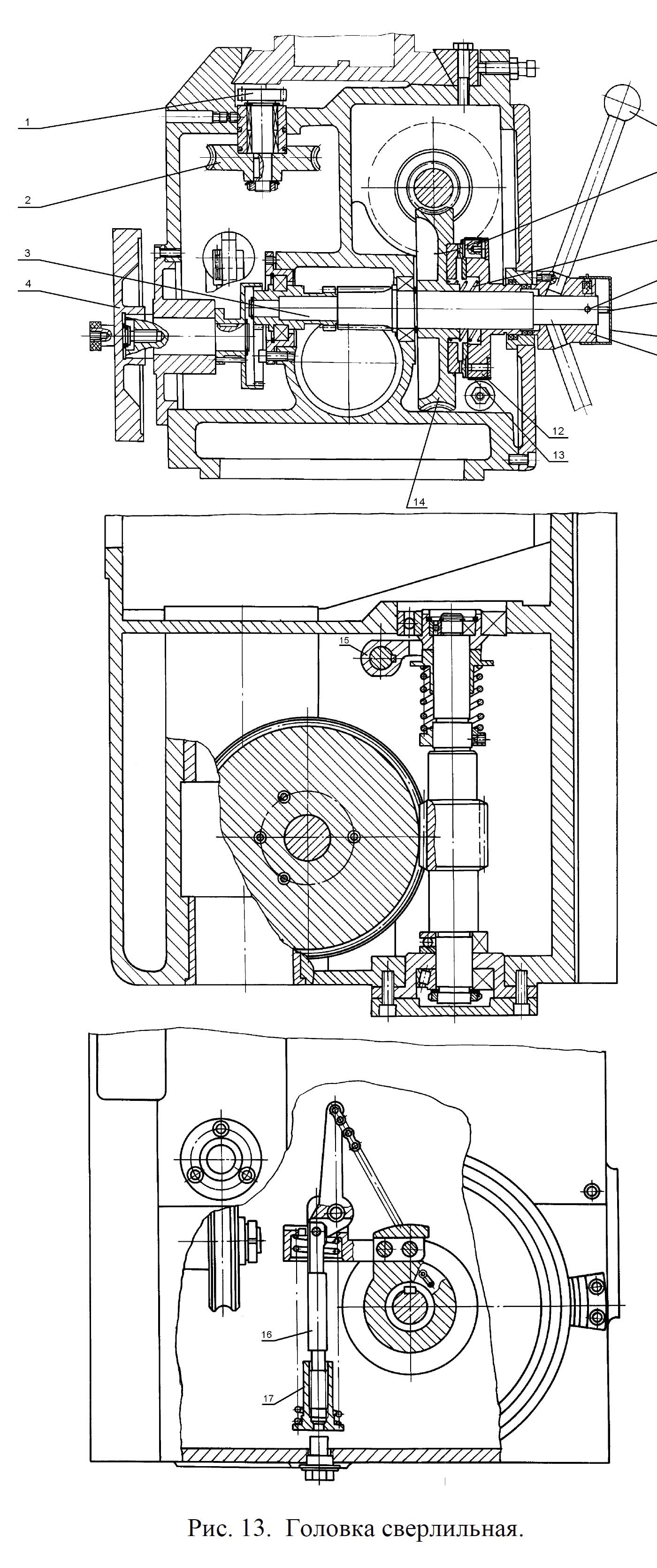 В сверлильной головке, з левой стороны, также имеется механізм ручного переміщення її вдоль колонны, который состоит из червяка з квадратом на наружном кінці, червячного колеса і реечной шестерни 1. Перемещение сверлильной головки возможно только при отжатом клине, расположенном з правой стороны сверлильной головки.
