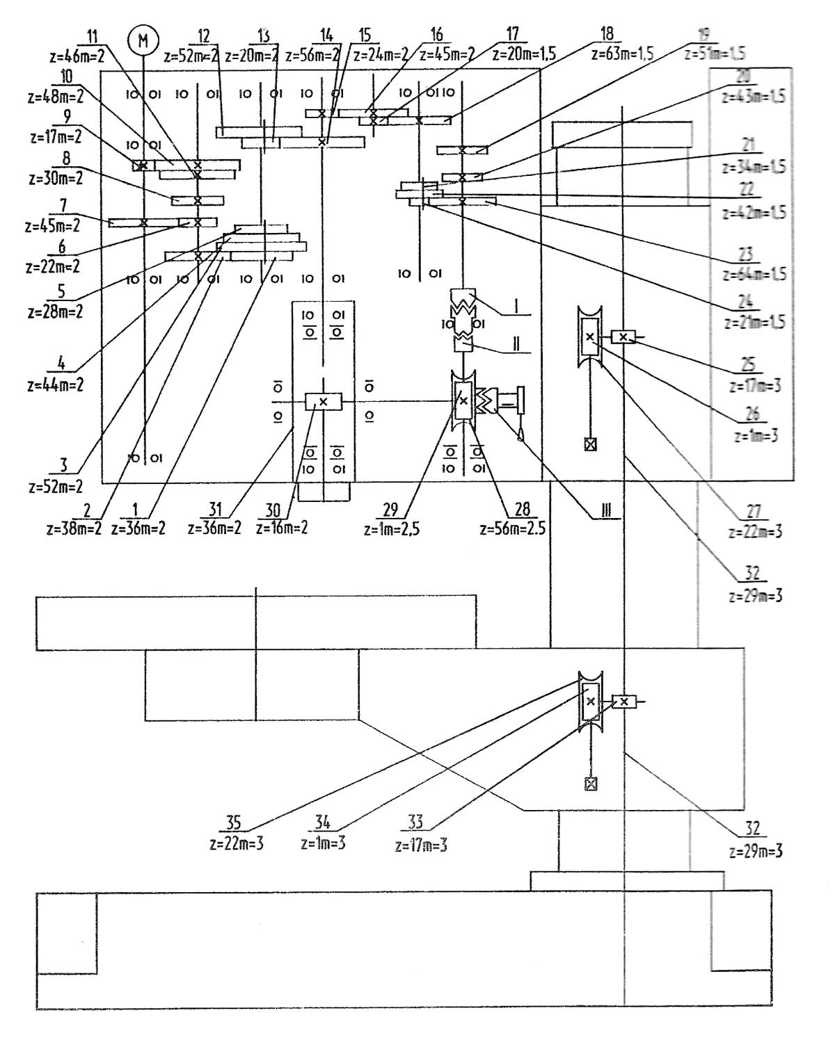 1. Кінематична схема свердлильного верстата 2Т140. Дивитись у збільшеному масштабі