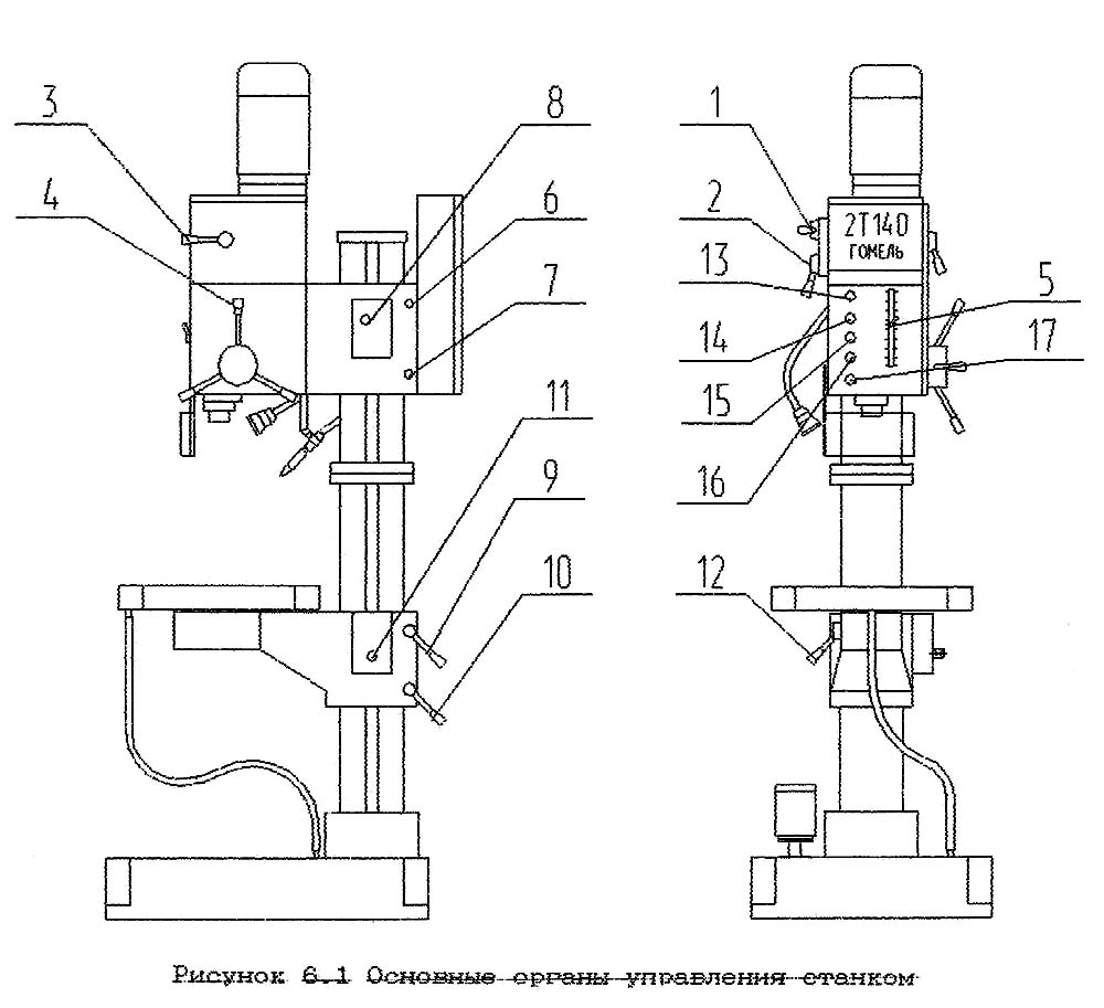 Розташування органів керування свердлильним верстатом 2Т140