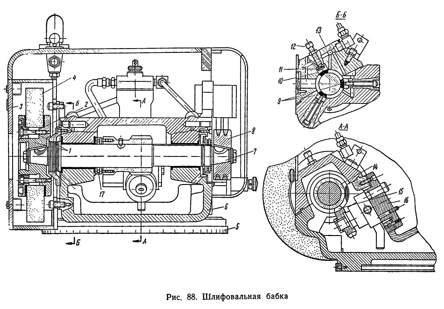Шпиндель шлифовальной бабки 7 (рис. 88) смонтирован на підшипниках ковзання. Осевое положение шпинделя фиксируется: з левой стороны — фланцем шпинделя, а з правой — упорным подшипником 17 Шлифовальный круг 4 устанавливается между фланцами 1 і закрепляется гвинтами 2.