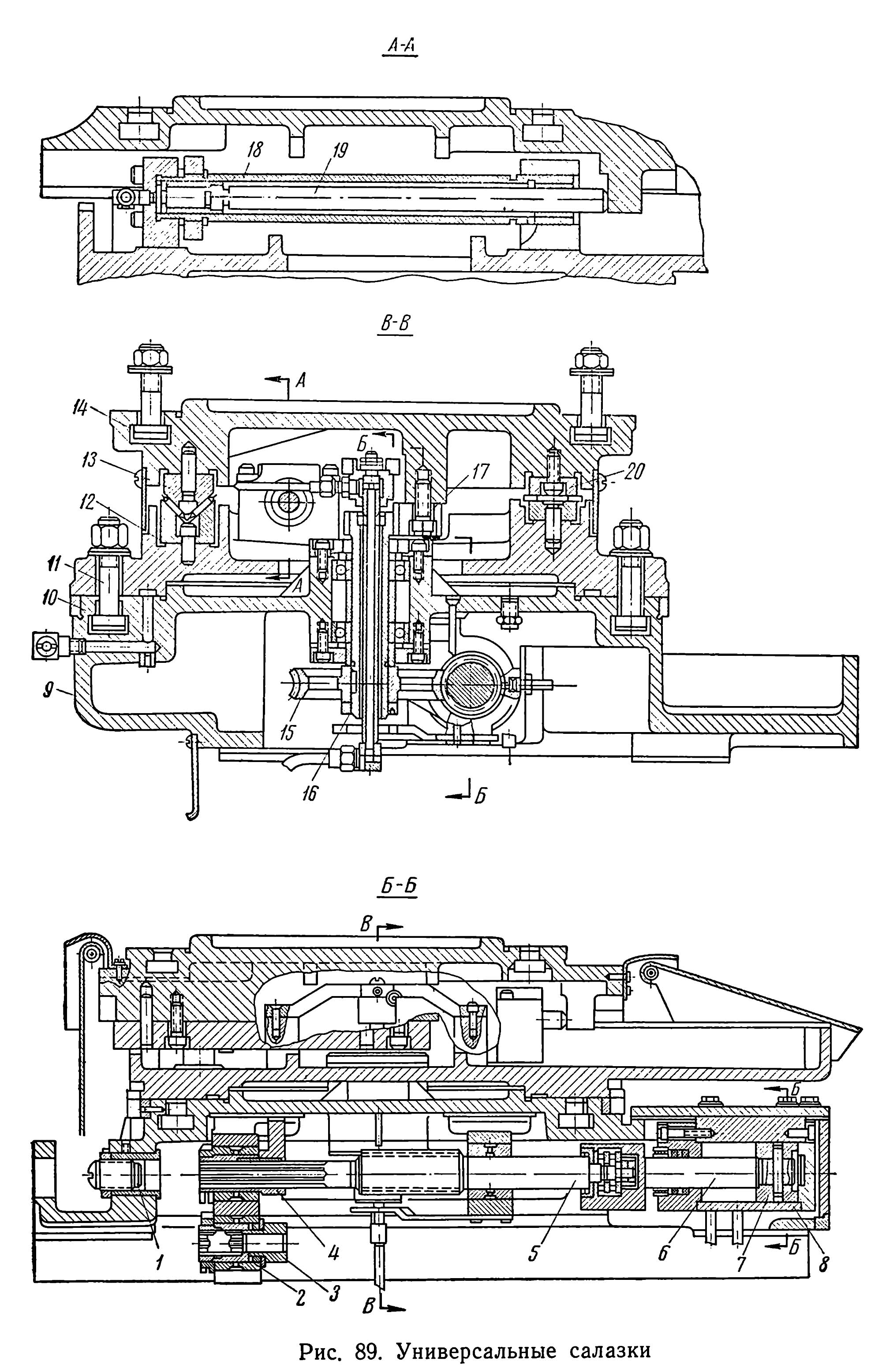 Салазки (рис. 89) предназначены для несения шлифовальной бабки. К нижней стороне верхних салазок 14 привернуты призматическая 13 і плоская 20 направляющие, которые через комплект промежуточных цилиндрических роликов опираются на соответствующие направляющие, привернутые к нижним салазкам. На нижней стороне нижних салазок имеется поворотная направляющая поверхность, которой они установлены на соответствующую поверхность основания 12. Для отсчета угла поворота нижних салазок имеется градуированное кольцо 10, привернутое к основанию 9. Крепление нижних салазок к основанию производится болтами 11, головки которых входят в Т-образный паз основания.