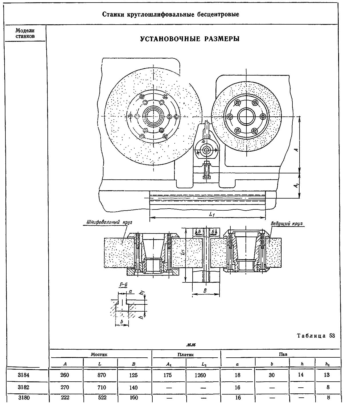 Станина 1 (рис. 58, а) выполнена в виде отливки коробчатого сечения з мостиком 18 для крепления суппорта, з прямоугольными роликовыми направляющими 15 для руху шлифовальной бабки 6 і такими же направляющими для руху бабки 12 ведущего круга. Точное перемещение каждой из бабок по направляющим регулируется клиньями 14 і болтами 4.