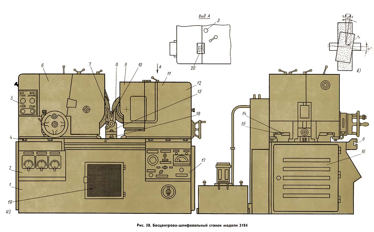 Загальний вигляд та компонування верстата показані на рис. 58 а. Основні вузли верстата: станина 1, бабка 6 шліфувального кола, бабка 12 ведучого кола, супорт 13