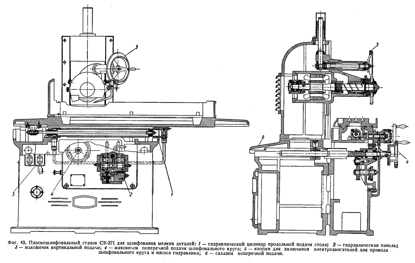 Крім автоматичної подачі верстат 371 дозволяє маховичком 9, що обертає зубчасте колесо 25 робити ручне переміщення столу. Це колесо під дією пружини знаходиться у постійному зачепленні із рейкою столу. Щоб скористатися ручним переміщенням, необхідно вимкнути пусковий кран рукояткою 14. Тоді олія отримає вільний вихід із гідравлічної системи в резервуар 35 через поздовжню канавку пускового крана і дозволить переміщати стіл зубчастиним колесом 25.
