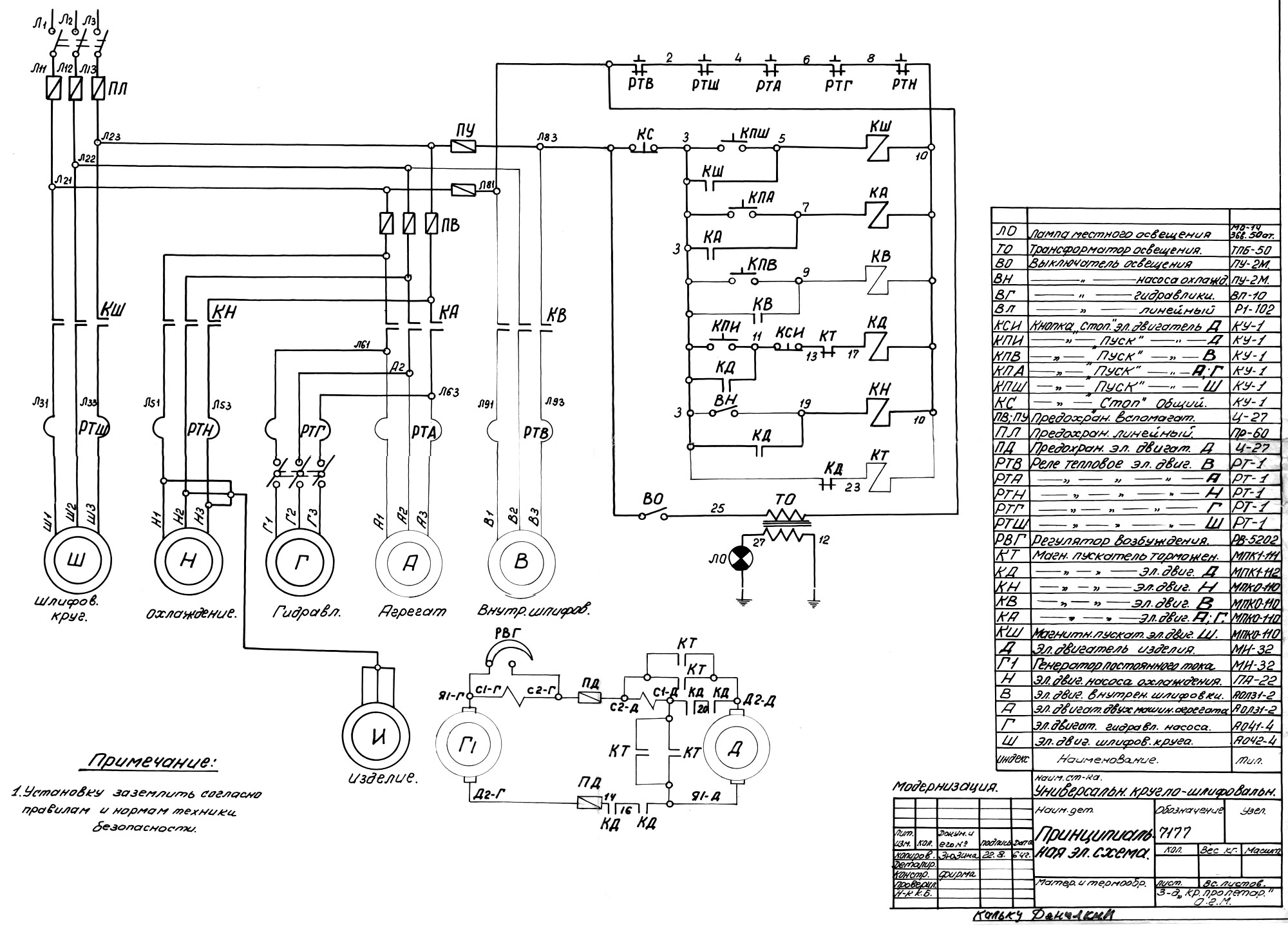 Увімкнення і відключення двигателей шлифовальных кругов осуществляется кнопками Кн3, Кн4 і магнитными пускателями Р8 і Р9.